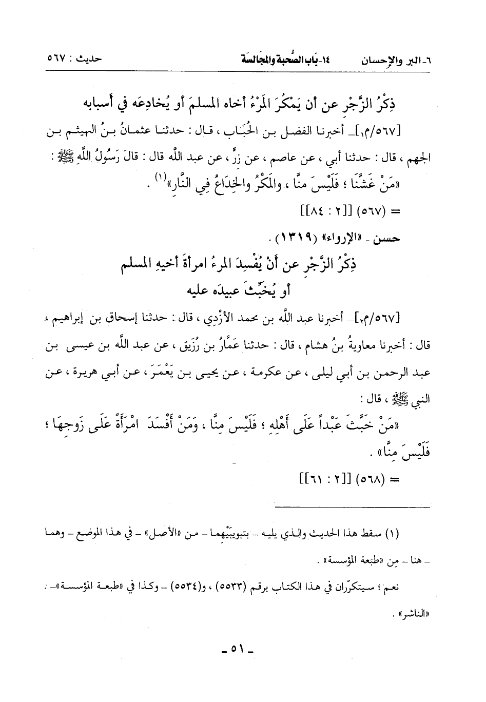 (¬1) سقط هذا الحديث والذي يليه ـ بتبويبيهما ـ من ((الأصل)) ـ في هذا الموضع ـ وهما ـ هنا ـ من ((طبعة المؤسسة)).