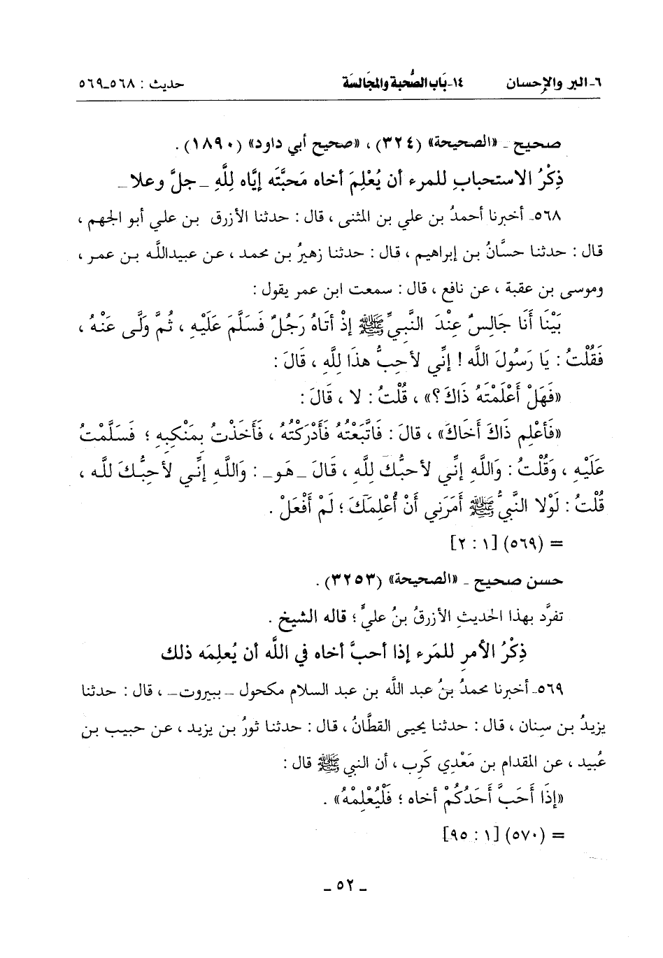 (فَأَعْلِمْ ذَاكَ أَخَاكَ) قَالَ: فَاتَّبَعْتُهُ فَأَدْرَكْتُهُ فَأَخَذْتُ بِمَنْكِبِهِ فَسَلَّمْتُ عَلَيْهِ وَقُلْتُ: وَاللَّهِ إِنِّي لَأُحِبُّكَ لِلَّهِ قَالَ هُوَ: وَاللَّهِ إِنِّي لَأُحِبُّكَ لِلَّهِ قُلْتُ: لَوْلَا النَّبِيُّ صَلَّى اللَّهُ عَلَيْهِ وَسَلَّمَ أمرني أن أُعلمك لم أفعل