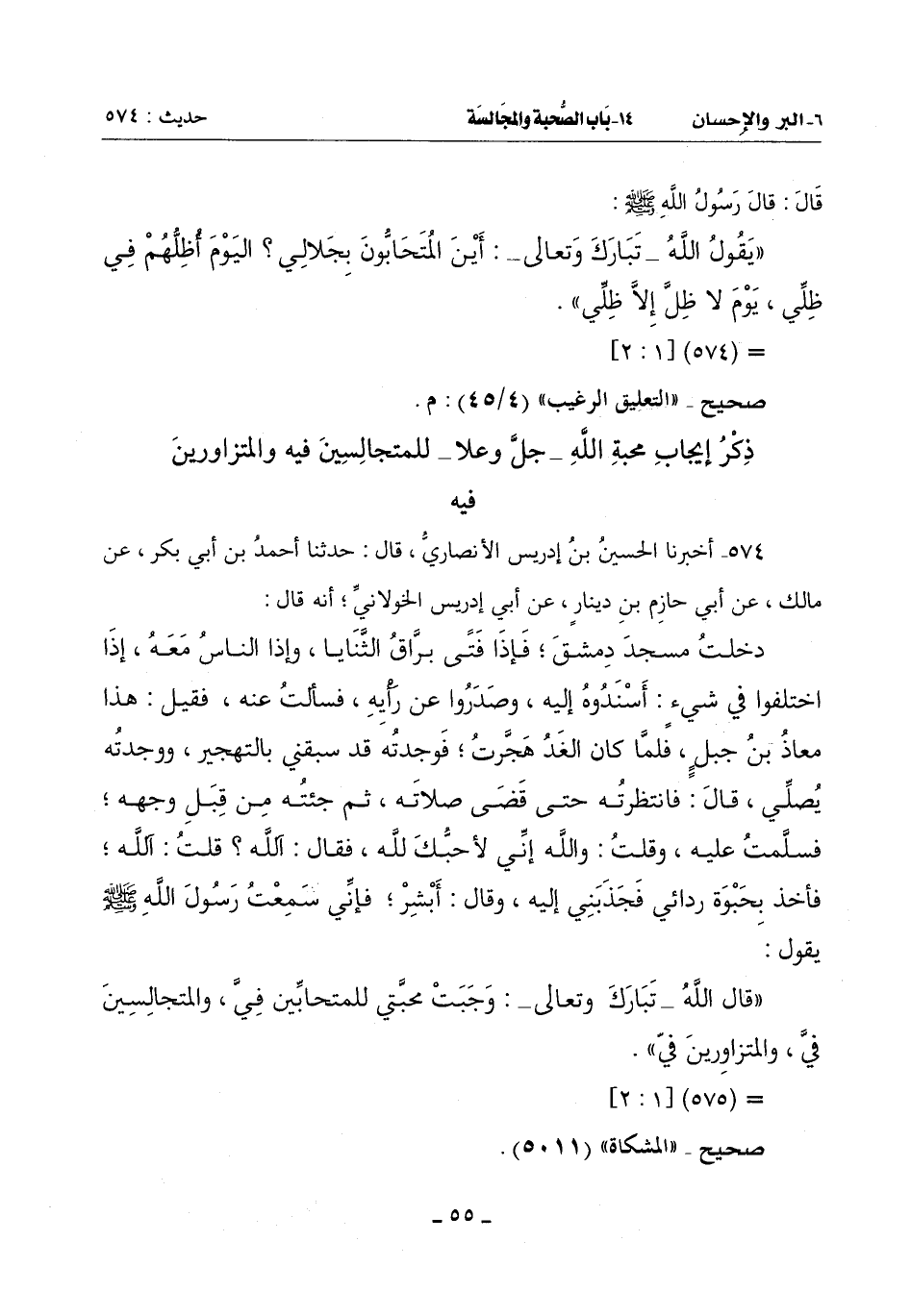 (قال اللَّهُ تَبَارَكَ وَتَعَالَى: وَجَبَتْ مَحَبَّتِي لِلْمُتَحَابِّينَ فيَّ والمتجالسين فيَّ والمتزاورين فيَّ)