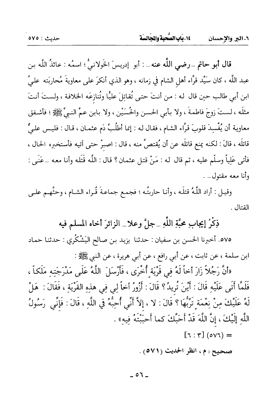 (إن رَجُلًا زَارَ أَخًا لَهُ فِي قَرْيَةٍ أُخْرَى فَأَرْسَلَ اللَّهُ عَلَى مَدْرَجَتِهِ مَلَكًا فَلَمَّا أَتَى عَلَيْهِ قَالَ: أَيْنَ تُرِيدُ؟ قَالَ: أَزُورُ أَخًا لِي فِي هَذِهِ الْقَرْيَةِ فقَالَ: هَلْ لَهُ عَلَيْكَ مِنْ نِعْمَةٍ تَرُبُّهَا؟ قَالَ: لَا إِلَّا أَنِّي أُحِبُّهُ فِي اللَّهِ قَالَ: فَإِنِّي رَسُولُ اللَّهِ إِلَيْكَ إِنَّ اللَّهَ قَدْ أَحَبَّكَ كَمَا أحببته فيه)