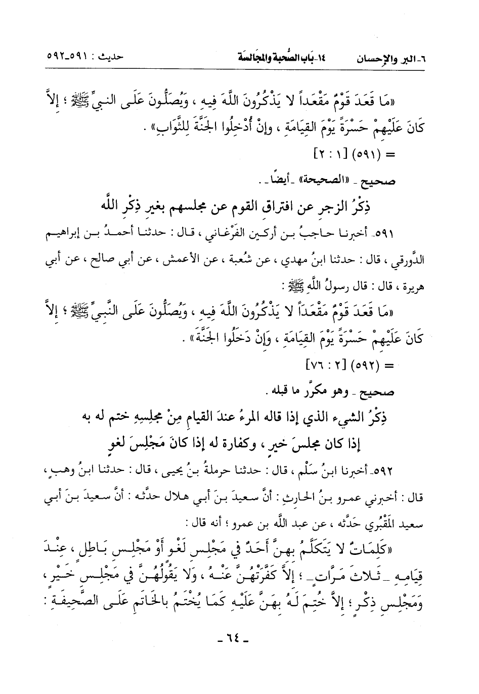 (كَلِمَاتٌ لَا يَتَكَلَّمُ بِهِنَّ أَحَدٌ فِي مَجْلِسِ لَغْوٍ أَوْ مَجْلِسِ بَاطِلٍ عِنْدَ قِيَامِهِ - ثَلَاثَ مَرَّاتٍ - إِلَّا كَفَّرَتْهُنَّ عَنْهُ وَلَا يقولهنَّ فِي مَجْلِسِ خَيْرٍ وَمَجْلِسِ ذِكْرٍ إِلَّا خُتم لَهُ بِهِنَّ عَلَيْهِ كَمَا يُخْتَمُ بِالْخَاتَمِ عَلَى الصَّحِيفَةِ: -[65]- سُبْحَانَكَ اللَّهُمَّ وَبِحَمْدِكَ لَا إِلَهَ إِلَّا أَنْتَ أَسْتَغْفِرُكَ وَأَتُوبُ إِلَيْكَ)