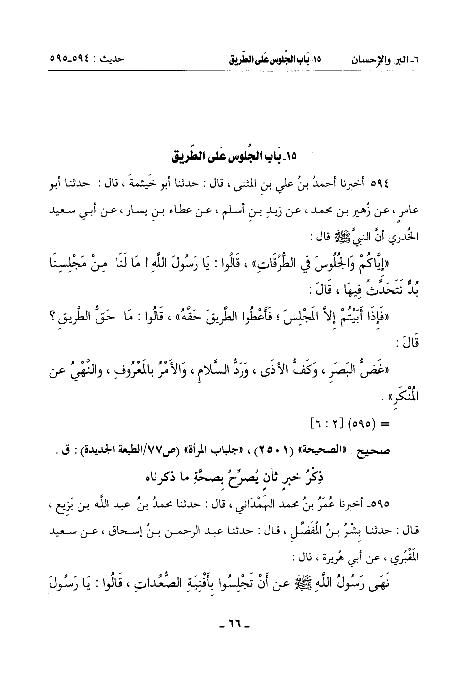 نَهَى رَسُولُ اللَّهِ صَلَّى اللَّهُ عَلَيْهِ وَسَلَّمَ عَنْ أَنْ تَجْلِسُوا بِأَفْنِيَةِ الصُّعُدَاتِ قَالُوا: يَا رَسُولَ -[67]- اللَّهِ إِنَّا لَا نَسْتَطِيعُ ذَلِكَ وَلَا نُطِيقُهُ قَالَ: