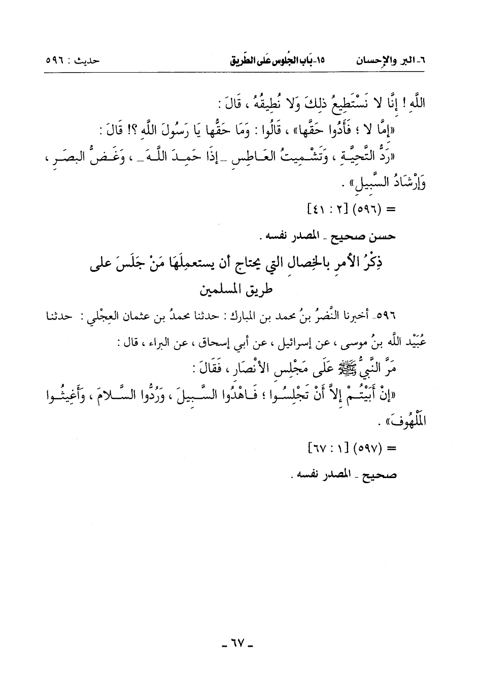 ذِكْرُ الْأَمْرِ بِالْخِصَالِ الَّتِي يَحْتَاجُ أَنْ يَسْتَعْمِلَهَا مَنْ جَلَسَ عَلَى طَرِيقِ الْمُسْلِمِينَ