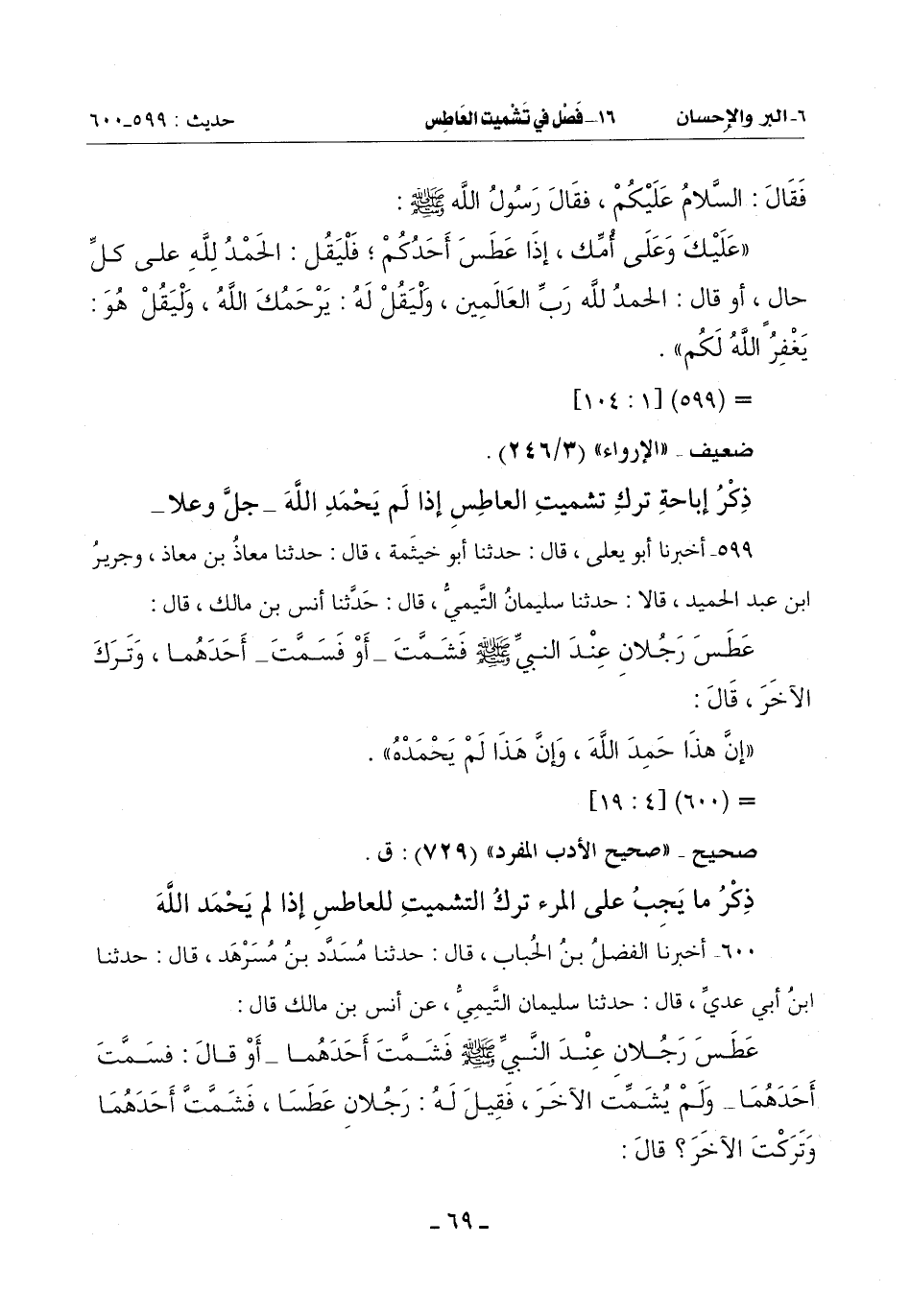 عَطَسَ رَجُلَانِ عِنْدَ النَّبِيِّ صَلَّى اللَّهُ عَلَيْهِ وَسَلَّمَ فشمَّت أَحَدَهُمَا - أَوْ قَالَ: فسمَّت أَحَدَهُمَا - وَلَمْ يُشَمِّتِ الْآخَرَ فَقِيلَ لَهُ: رَجُلَانِ عَطَسَا فشمَّت أَحَدَهُمَا وَتَرَكْتَ الْآخَرَ: قَالَ: -[70]-