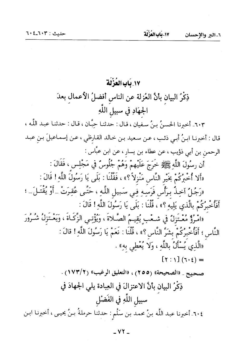 (امْرُؤٌ مُعْتَزِلٌ فِي شِعْبٍ يُقِيمُ الصَّلَاةَ وَيُؤْتِي الزَّكَاةَ وَيَعْتَزِلُ شُرُورَ النَّاسِ أَفَأُخْبِرُكُمْ بِشَرِّ النَّاسِ)؟ قُلْنَا: نَعَمْ يَا رَسُولَ اللَّهِ قَالَ: