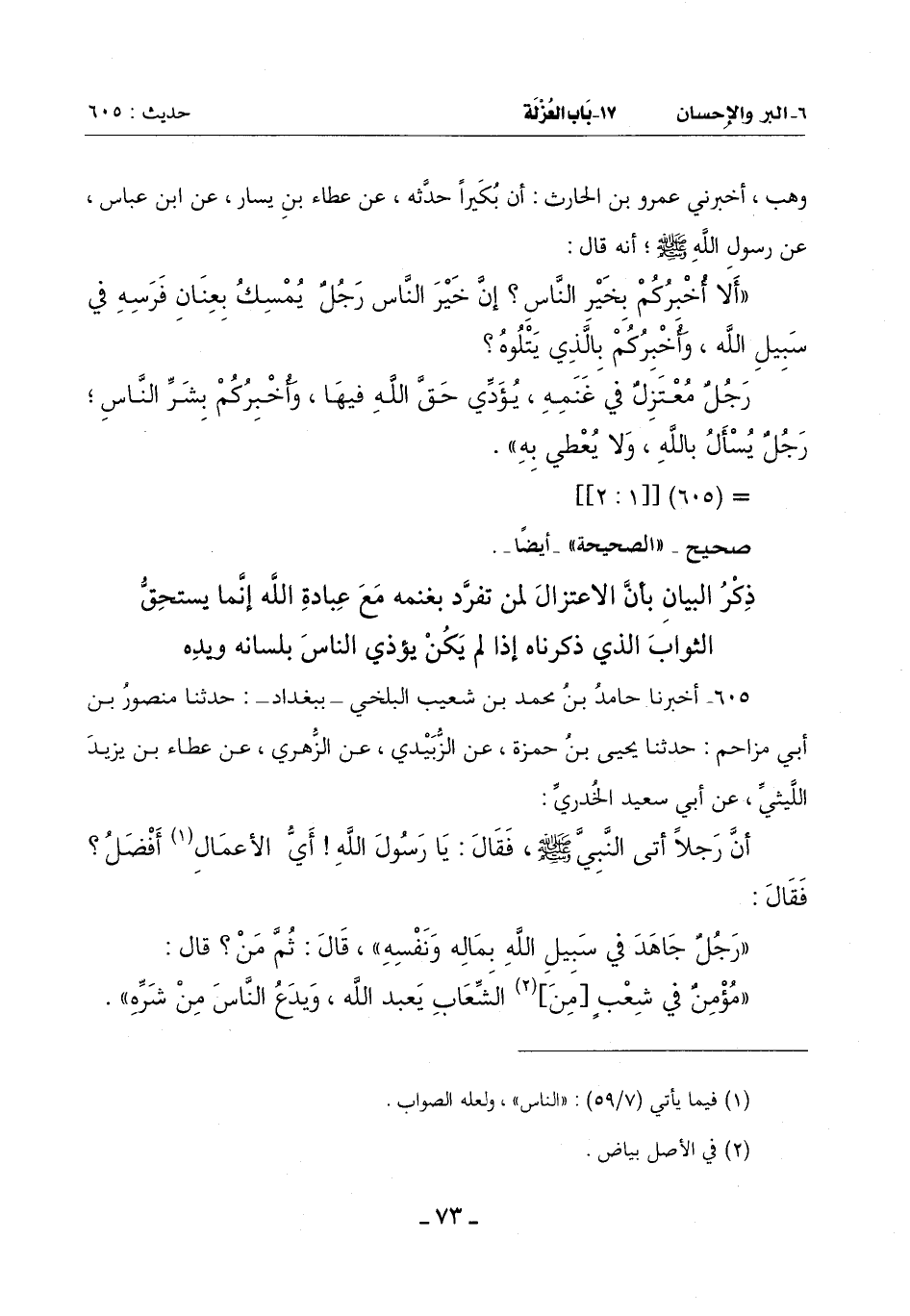 (مُؤْمِنٌ فِي شِعْبٍ [مِنَ] (¬2) الشِّعَابِ يَعْبُدُ اللَّهَ ويدع الناس من شره) -[74]-