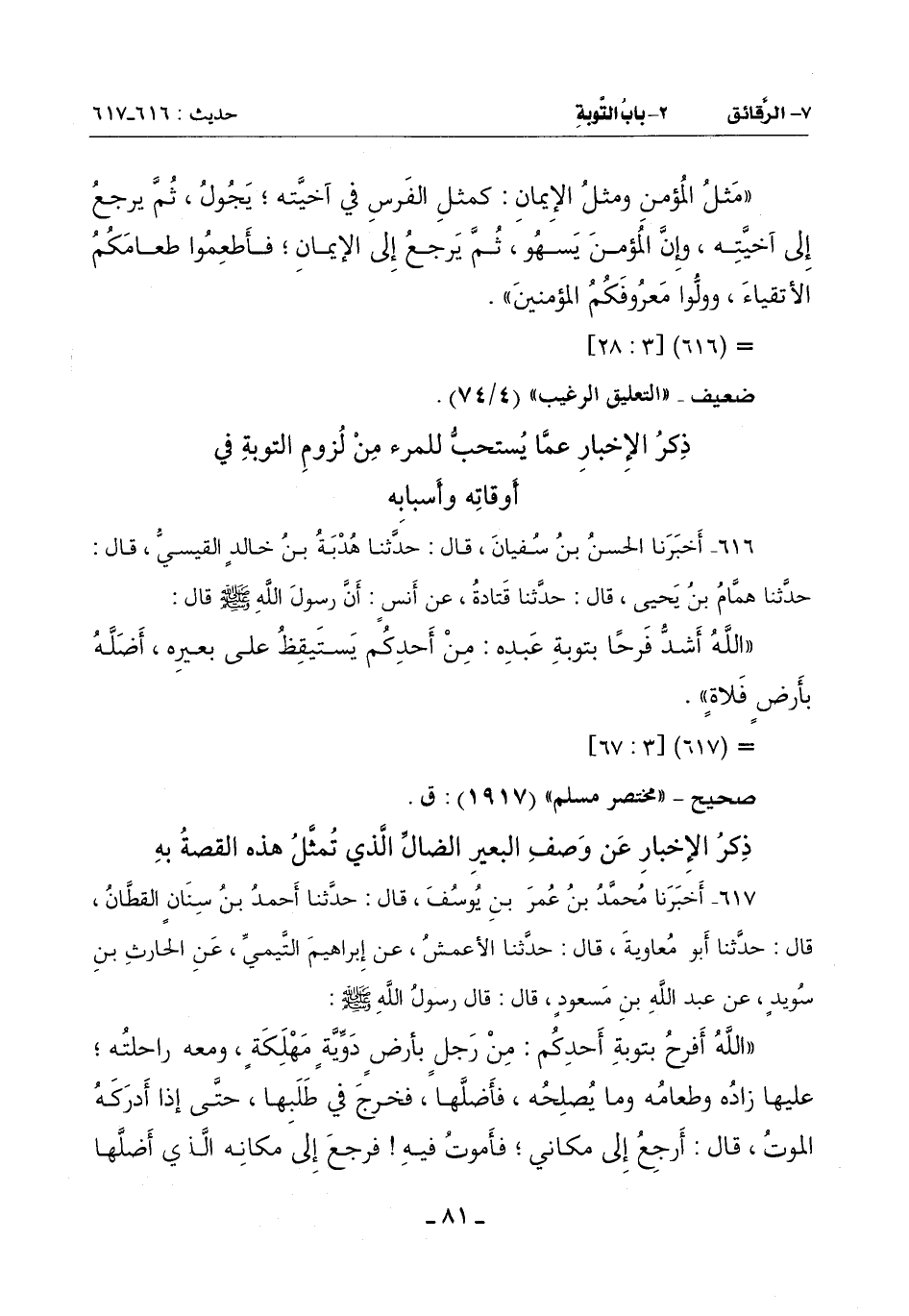 (اللَّهُ أَفْرَحُ بِتَوْبَةِ أَحَدِكُمْ مِنْ رَجُلٍ بِأَرْضٍ دَوِّيَّةٍ مَهْلَِكَةٍ وَمَعَهُ رَاحِلَتُهُ عَلَيْهَا زَادُهُ وَطَعَامُهُ وَمَا يُصْلِحُهُ فَأَضَلَّهَا فَخَرَجَ فِي طَلَبِهَا حَتَّى إِذَا أَدْرَكَهُ الْمَوْتُ قَالَ: أَرْجِعُ إِلَى مَكَانِي فَأَمُوتُ فِيهِ فَرَجَعَ إِلَى مَكَانِهِ الَّذِي أَضَلَّهَا -[82]- فِيهِ فَبَيْنَمَا هُوَ كَذَلِكَ إِذْ غَلَبَتْهُ عَيْنُهُ فَاسْتَيْقَظَ فَإِذَا رَاحِلَتُهُ عِنْدَ رَأْسِهِ عَلَيْهَا زَادُهُ وَمَا يُصْلِحُهُ فَاللَّهُ أفرح بتوبة أحدكم من هذا الرجل)