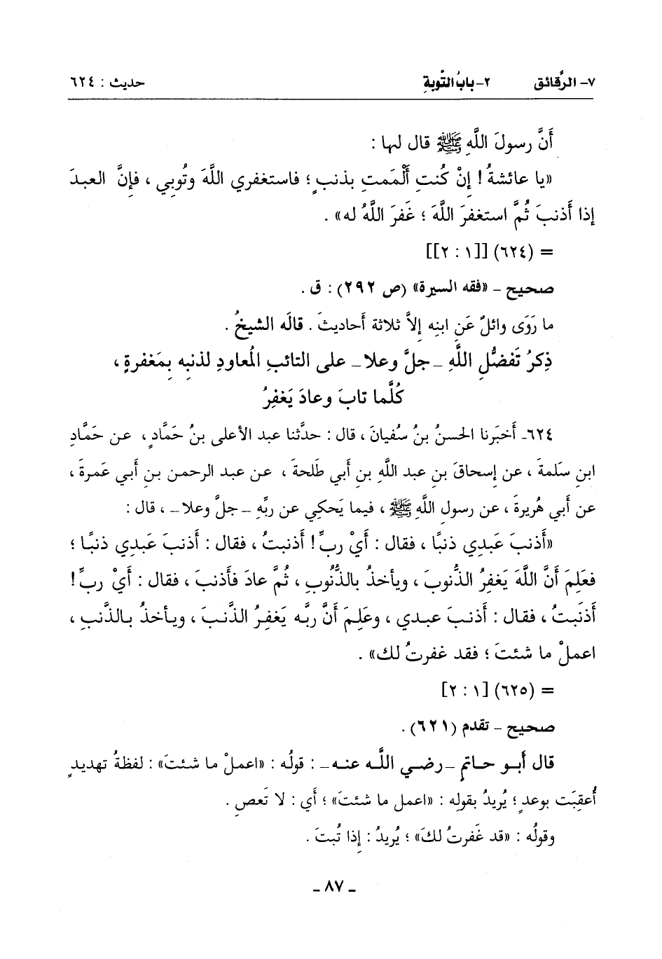 (أَذْنَبَ عَبْدِي ذَنْبًا فقَالَ: أَيْ رَبِّ أَذْنَبْتُ فقَالَ: أَذْنَبَ عَبْدِي ذَنْبًا فَعَلِمَ أَنَّ اللَّهَ يَغْفِرُ الذُّنُوبَ وَيَأْخُذُ بِالذُّنُوبِ ثُمَّ عَادَ فَأَذْنَبَ فقَالَ: أَيْ رَبِّ أَذْنَبْتُ فقَالَ: أَذْنَبَ عَبْدِي وَعَلِمَ أَنَّ رَبَّهُ يَغْفِرُ الذَّنْبَ وَيَأْخُذُ بِالذَّنْبِ اعْمَلْ مَا شِئْتَ فَقَدْ غفرت لك)