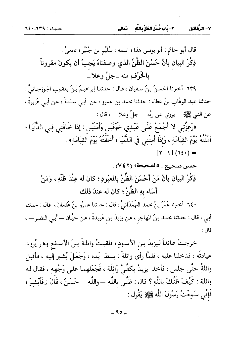 ذِكْرُ الْبَيَانِ بِأَنَّ حُسْنَ الظَّنِّ الَّذِي وَصَفْنَاهُ يَجِبُ أَنْ يَكُونَ مَقْرُونًا بِالْخَوْفِ مِنْهُ جَلَّ وعلا