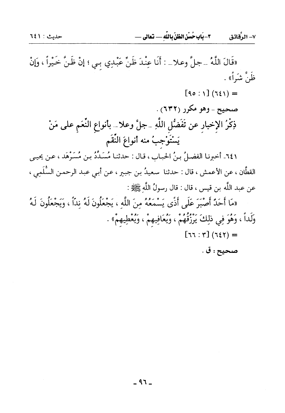 641 - أَخْبَرَنَا الْفَضْلُ بْنُ الْحُبَابِ قَالَ: حَدَّثَنَا مُسَدَّدٌ بْنُ مُسَرْهَدٍ عَنْ يَحْيَى الْقَطَّانِ عَنِ الْأَعْمَشِ قَالَ: حَدَّثَنَا سَعِيدُ بْنُ جُبَيْرٍ عَنْ أَبِي عَبْدِ الرَّحْمَنِ السُّلَمِيِّ عَنْ عَبْدِ اللَّهِ بْنِ قَيْسٍ قَالَ: قَالَ رَسُولُ اللَّهِ صَلَّى اللَّهُ عَلَيْهِ وَسَلَّمَ:
