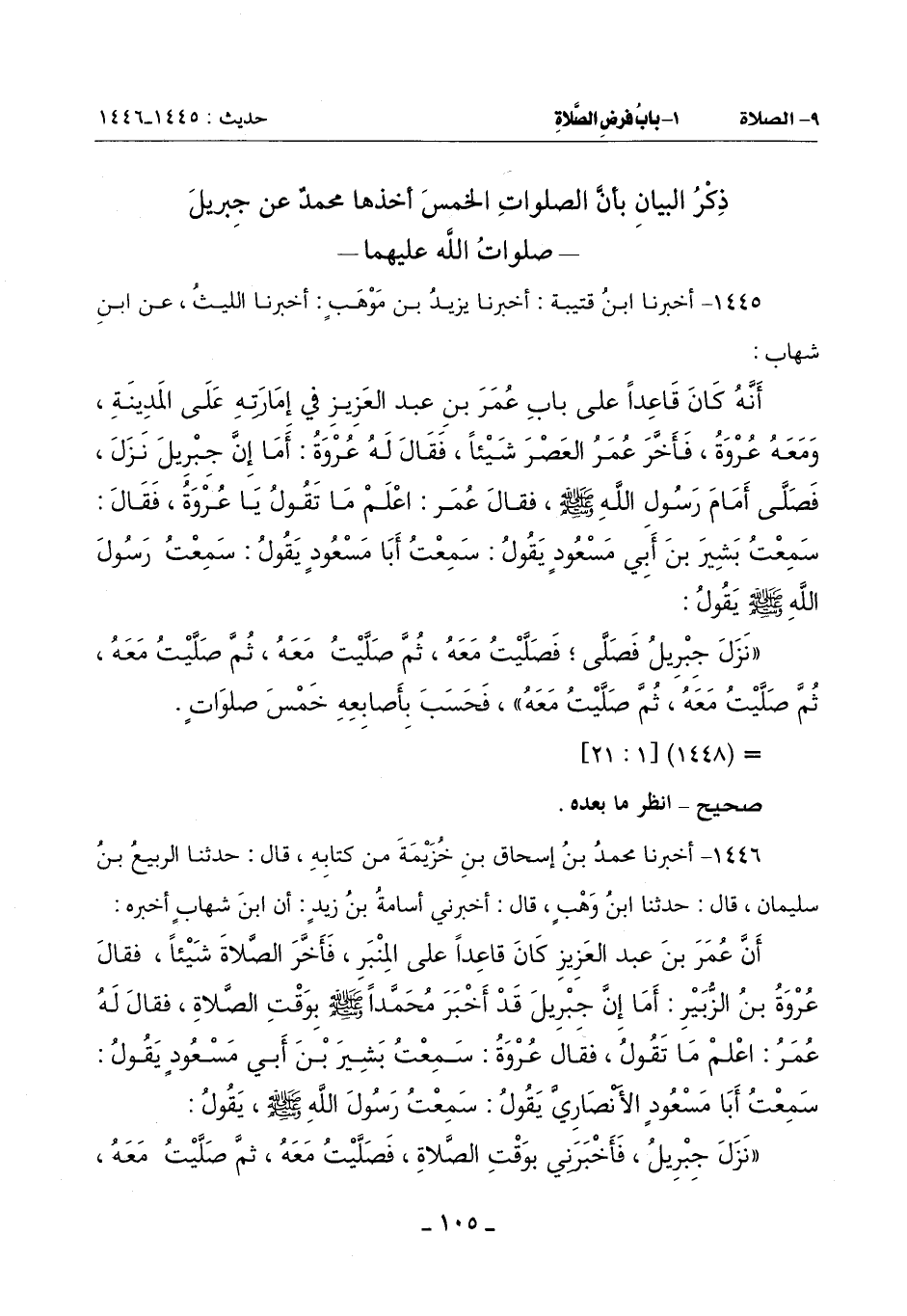 (نَزَلَ جِبْرِيلُ فَأَخْبَرَنِي بِوَقْتِ الصَّلَاةِ فَصَلَّيْتُ مَعَهُ ثُمَّ صَلَّيْتُ مَعَهُ -[106]- ثُمَّ صَلَّيْتُ مَعَهُ ثُمَّ صَلَّيْتُ مَعَهُ ثُمَّ صَلَّيْتُ مَعَهُ) فَحَسَبَ بِأَصَابِعِهِ خَمْسَ صَلَوَاتٍ