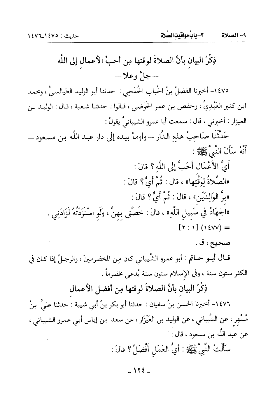 1475 - أَخْبَرَنَا الْفَضْلُ بْنُ الْحُبَابِ الْجُمَحِيُّ حَدَّثَنَا أَبُو الْوَلِيدِ الطَّيَالِسِيُّ وَمُحَمَّدُ بْنُ كَثِيرٍ الْعَبْدِيُّ وَحَفْصُ بْنُ عُمَرَ الْحَوْضِيُّ قَالُوا: حَدَّثَنَا شُعْبَةُ قَالَ: الْوَلِيدُ بْنُ الْعَيْزَارِ أَخْبَرَنِي قَالَ: سَمِعْتُ أَبَا عَمْرٍو الشَّيْبَانِيَّ يَقُولُ:
