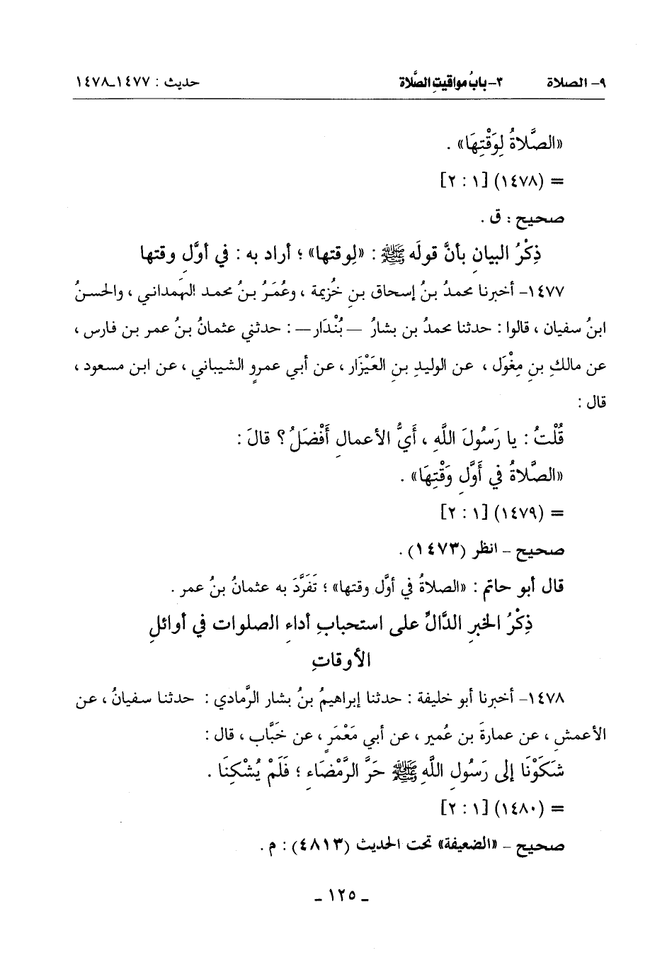 1477 - أَخْبَرَنَا مُحَمَّدُ بْنُ إِسْحَاقَ بْنِ خُزَيْمَةَ وَعُمَرُ بْنُ مُحَمَّدٍ الْهَمْدَانِيُّ وَالْحَسَنُ بْنُ سُفْيَانَ قَالُوا: حَدَّثَنَا مُحَمَّدُ بْنُ بَشَّارٍ بُنْدَارٌ حَدَّثَنِي عُثْمَانُ بْنُ عُمَرَ بْنِ فَارِسٍ عَنْ مَالِكِ بْنِ مِغْوَلٍ عَنِ الْوَلِيدِ بْنِ الْعَيْزَارِ عَنْ أَبِي عَمْرٍو الشَّيْبَانِيِّ: عَنِ ابْنِ مَسْعُودٍ قَالَ: