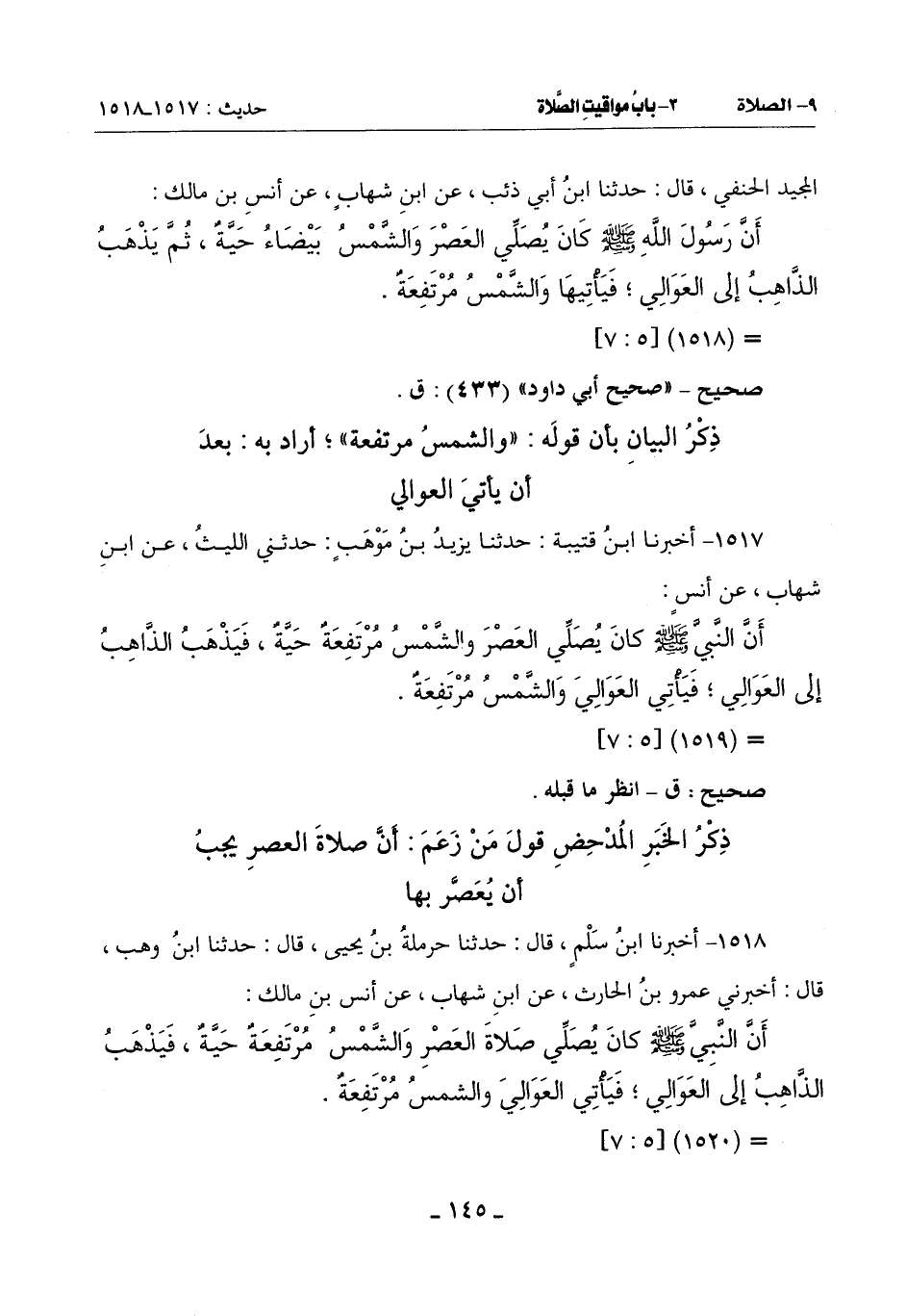 أَنَّ النَّبِيَّ صَلَّى اللَّهُ عَلَيْهِ وَسَلَّمَ كَانَ يُصَلِّي صَلَاةَ الْعَصْرِ وَالشَّمْسُ مُرْتَفِعَةٌ حَيَّةٌ فَيَذْهَبُ الذَّاهِبُ إِلَى الْعَوَالِي فَيَأْتِي العوالي والشمس مرتفعة