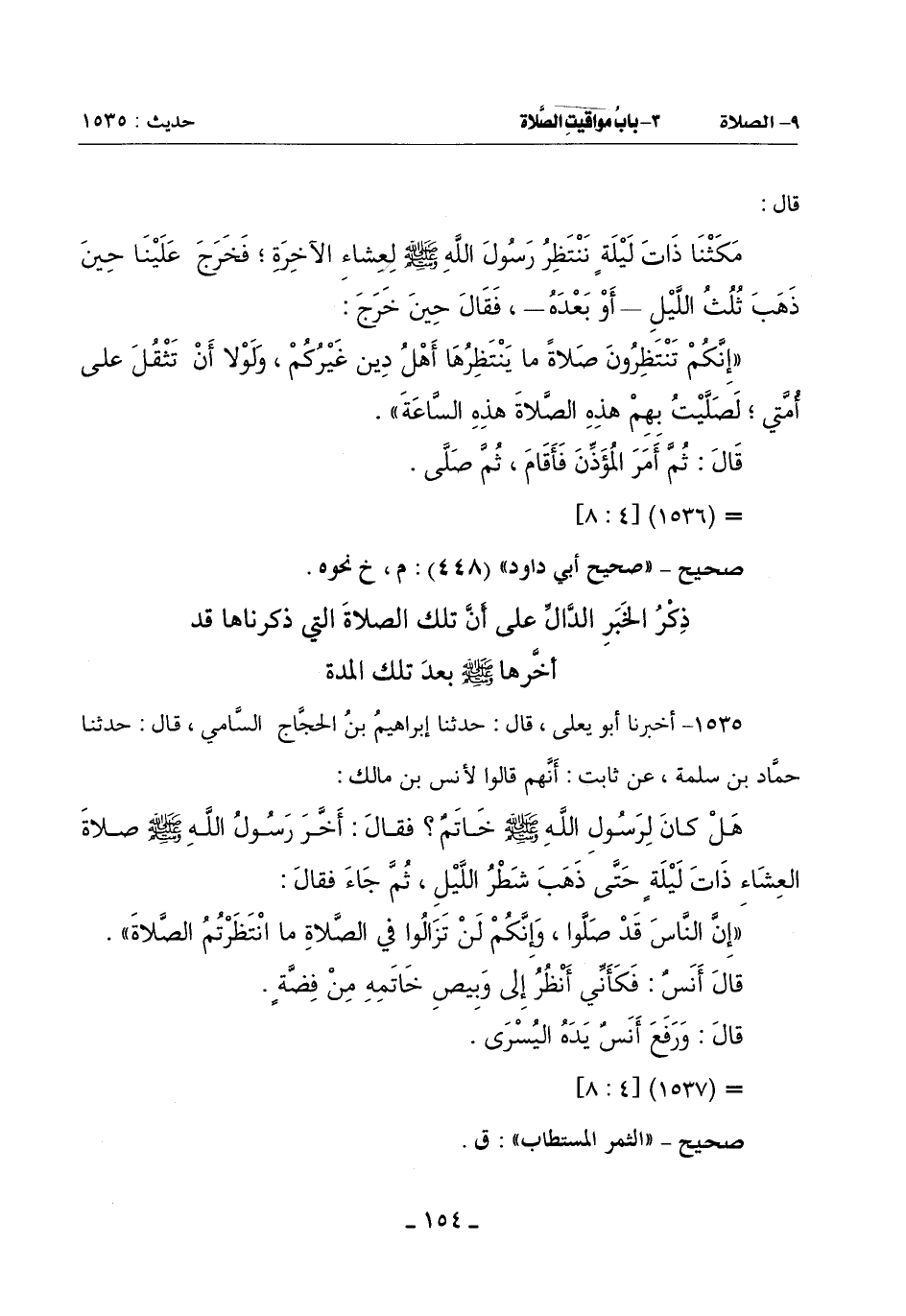 هَلْ كَانَ لِرَسُولِ اللَّهِ صَلَّى اللَّهُ عَلَيْهِ وَسَلَّمَ خَاتَمٌ؟ فَقَالَ أخَّر رَسُولُ اللَّهِ صَلَّى اللَّهُ عَلَيْهِ وَسَلَّمَ صَلَاةَ الْعِشَاءِ ذَاتَ لَيْلَةٍ حَتَّى ذَهَبَ شَطْرُ اللَّيْلِ ثُمَّ جَاءَ فَقَالَ: