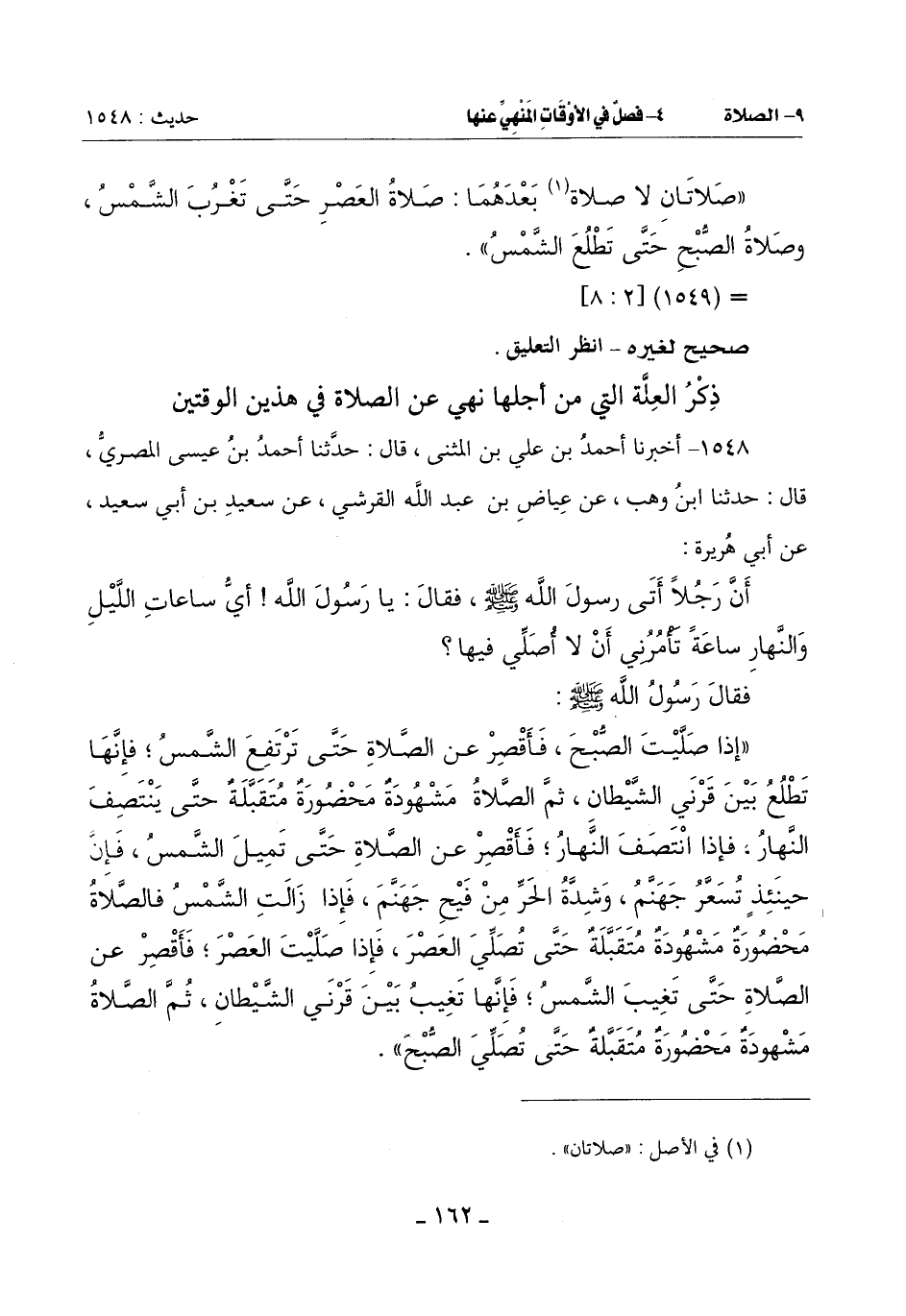 (إِذَا صَلَّيْتَ الصُّبْحَ فأَقْصِرْ عَنِ الصَّلَاةِ حَتَّى تَرْتَفِعَ الشَّمْسُ فَإِنَّهَا تَطْلُعُ بَيْنَ قَرْنَيِ الشَّيْطَانِ ثُمَّ الصَّلَاةُ مَشْهُودَةٌ مَحْضُورَةٌ مُتقبَّلة حَتَّى يَنْتَصِفَ النَّهَارُ فَإِذَا انْتَصَفَ النَّهَارُ فأَقْصِرْ عَنِ الصَّلَاةِ حَتَّى تَمِيلَ الشَّمْسُ فَإِنَّ حِينَئِذٍ تُسَعَّرُ جَهَنَّمُ وَشِدَّةُ الْحَرِّ مِنْ فَيْحِ جَهَنَّمَ فَإِذَا زَالَتِ الشَّمْسُ فَالصَّلَاةُ مَحْضُورَةٌ مَشْهُودَةٌ مُتَقَبَّلَةٌ حَتَّى تُصَلِّيَ الْعَصْرَ فَإِذَا صَلَّيْتَ الْعَصْرَ فأَقْصِرْ عَنِ الصَّلَاةِ حَتَّى تَغِيبَ الشَّمْسُ فَإِنَّهَا تَغِيبُ بَيْنَ قَرْنَيِ الشَّيْطَانِ ثُمَّ الصَّلَاةُ مشهودة محضورة متقبلة حتى تصلي الصبح) -[163]-