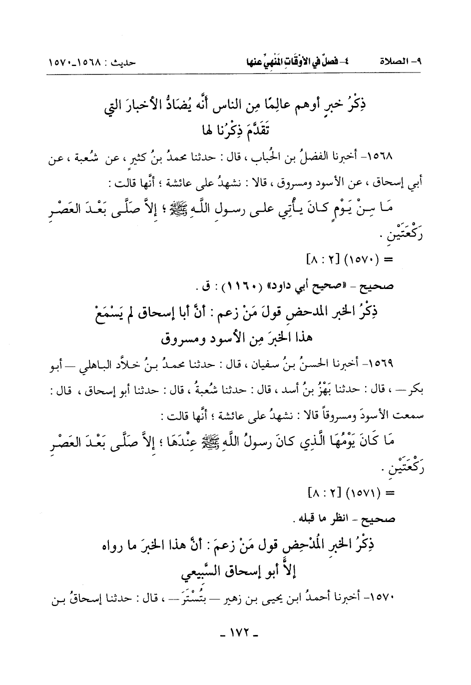 1568 - أخبرنا الفضلبن الْحُبَابِ قَالَ: حَدَّثَنَا مُحَمَّدُ بْنُ كَثِيرٍ عَنْ شُعْبَةَ عَنْ أَبِي إِسْحَاقَ عَنِ الْأَسْوَدِ وَمَسْرُوقٍ قَالَا: نَشْهَدُ عَلَى عَائِشَةَ أَنَّهَا قَالَتْ: