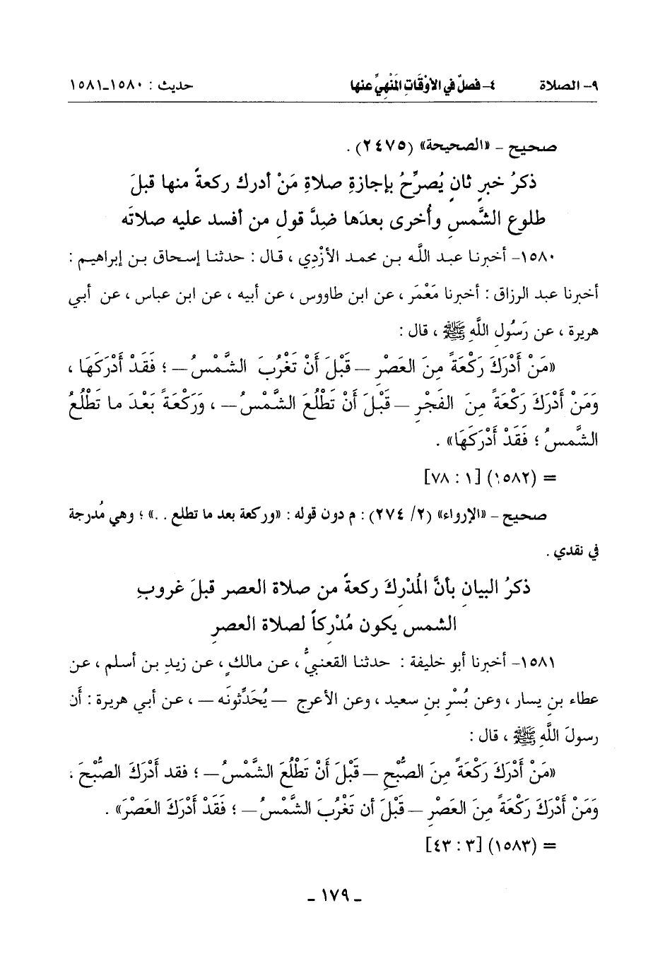(مَنْ أَدْرَكَ رَكْعَةً مِنَ الْعَصْرِ قَبْلَ أَنْ تَغْرُبَ الشَّمْسُ فَقَدْ أَدْرَكَهَا وَمَنْ أَدْرَكَ رَكْعَةً مِنَ الْفَجْرِ قَبْلَ أَنْ تَطْلُعَ الشَّمْسُ وَرَكْعَةً بَعْدَ مَا تطلع الشمس فقد أدركها)