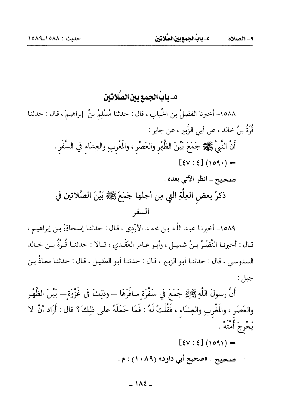 إن رسول الله صلى اللَّهُ عَلَيْهِ وَسَلَّمَ جَمَعَ فِي سَفْرَةٍ سَافَرَهَا وَذَلِكَ فِي غَزْوَةٍ بَيْنَ الظُّهْرِ وَالْعَصْرِ وَالْمَغْرِبِ وَالْعِشَاءِ فَقُلْتُ لَهُ: فَمَا حَمَلَهُ عَلَى ذَلِكَ؟ قال: أراد أن لا يُحرج أمته