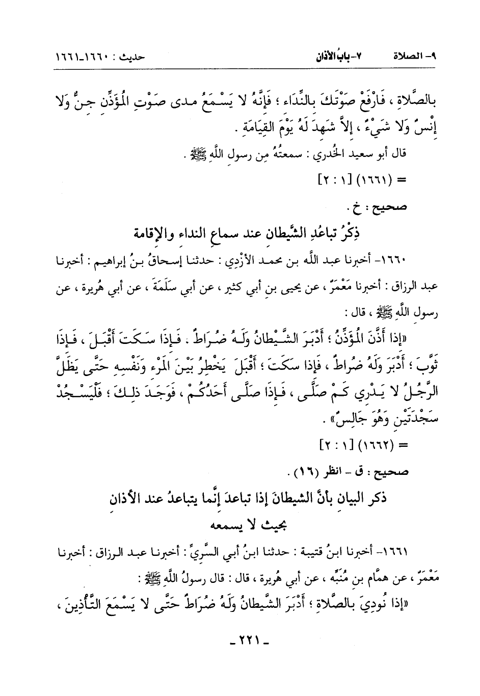 (إذا نُودِيَ بِالصَّلَاةِ أَدْبَرَ الشَّيْطَانُ وَلَهُ ضُرَاطٌ حَتَّى لَا يَسْمَعَ التَّأْذِينَ -[222]- فَإِذَا قُضِيَ التَّأْذِينُ أَقْبَلَ حَتَّى إِذَا ثُوِّب بِهَا أَدْبَرَ حَتَّى إِذَا قُضي التَّثْوِيبُ أَقْبَلَ حَتَّى يَخْطِرَ بَيْنَ الْمَرْءِ وَنَفْسِهِ يَقُولُ: اذْكُرْ كَذَا اذْكُرْ كَذَا لِمَا لَمْ يَكُنْ يَذْكُرُ مِنْ قَبْلُ حَتَّى يَظَلَّ الرجل لا يدري كم صلى)