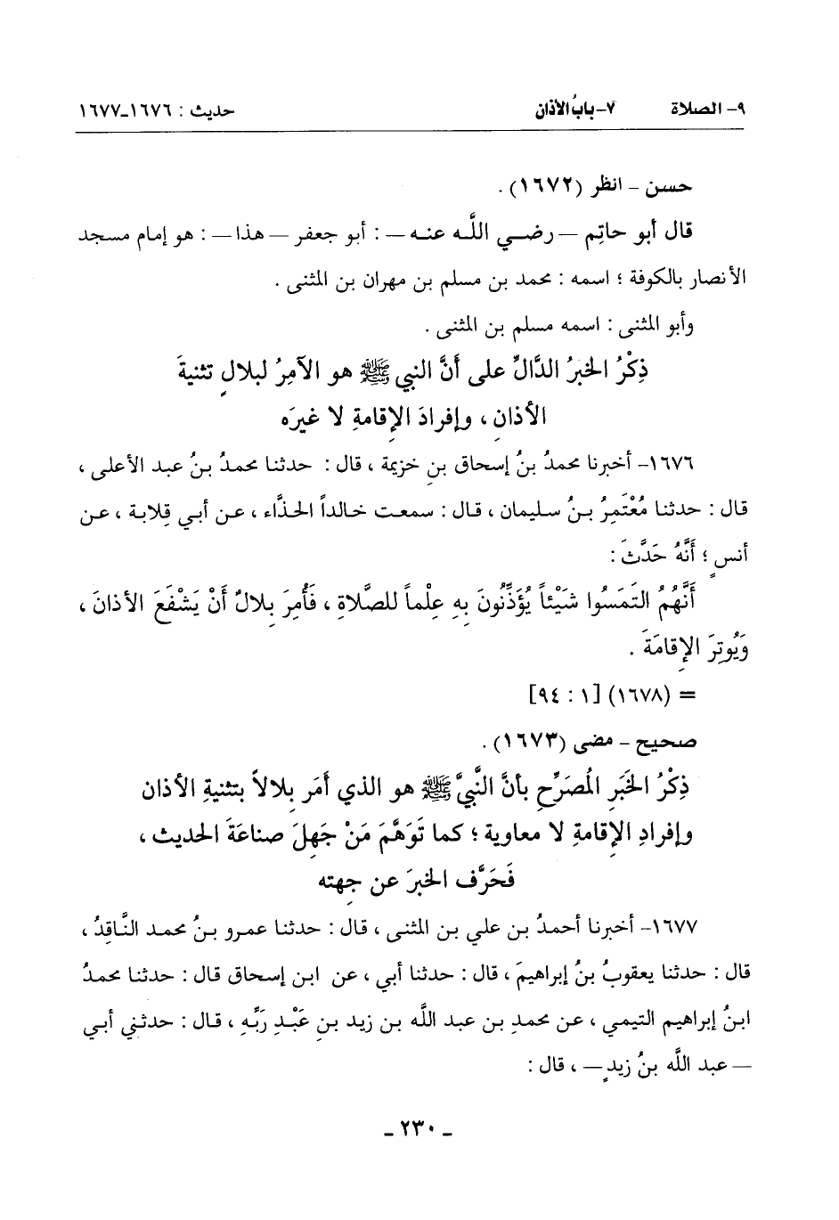 1677 - أَخْبَرَنَا أَحْمَدُ بْنُ عَلِيِّ بْنِ الْمُثَنَّى قَالَ: حَدَّثَنَا عَمْرُو بْنُ مُحَمَّدٍ النَّاقِدُ قَالَ: حَدَّثَنَا يَعْقُوبُ بْنُ إِبْرَاهِيمَ قَالَ: حَدَّثَنَا أَبِي عَنِ ابْنِ إِسْحَاقَ قَالَ: حَدَّثَنَا مُحَمَّدُ بْنُ إِبْرَاهِيمَ التَّيْمِيُّ عَنْ مُحَمَّدِ بْنِ عَبْدِ اللَّهِ بْنِ زَيْدِ بْنِ عَبْدِ رَبِّهِ قَالَ: حَدَّثَنِي أَبِي عَبْدُ اللَّهِ بْنِ زَيْدٍ قَالَ: -[231]-