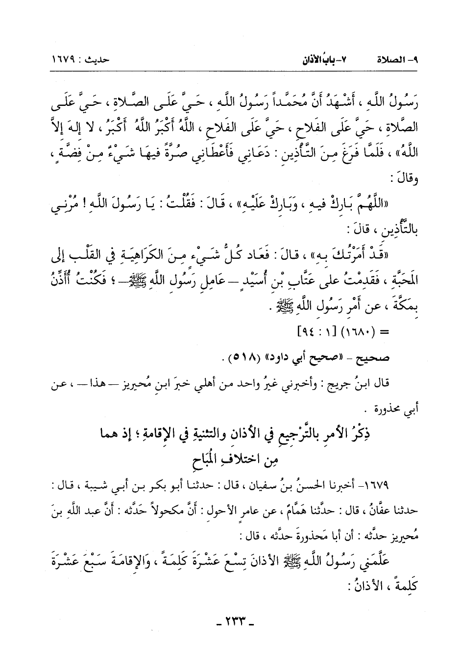 عَلَّمَنِي رَسُولُ اللَّهِ صَلَّى اللَّهُ عَلَيْهِ وَسَلَّمَ الْأَذَانَ تِسْعَ عَشْرَةَ كَلِمَةً وَالْإِقَامَةَ سَبْعَ عَشْرَةَ كَلِمَةً الْأَذَانُ: -[234]-