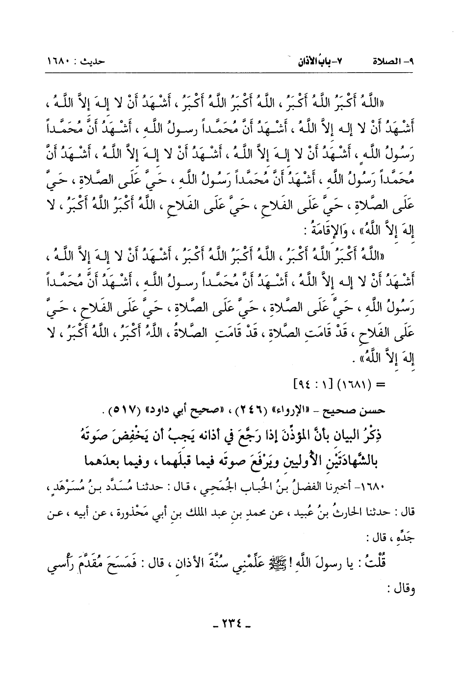 قُلْتُ: يَا رَسُولَ اللَّهِ صَلَّى اللَّهُ عَلَيْهِ وَسَلَّمَ عَلِّمني سُنَّةَ الْأَذَانِ قَالَ: فَمَسَحَ مُقَدَّمَ رَأْسِي وَقَالَ: -[235]-