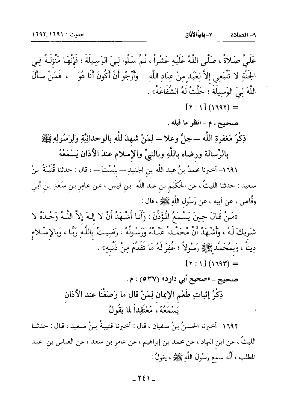 (مَنْ قَالَ حِينَ يَسْمَعُ الْمُؤَذِّنَ: وَأَنَا أَشْهَدُ أَنْ لَا إِلَهَ إِلَّا اللَّهُ وَحْدَهُ لَا شَرِيكَ لَهُ وَأَشْهَدُ أَنَّ مُحَمَّدًا عَبْدُهُ وَرَسُولُهُ رَضِيتُ بِاللَّهِ رَبًّا وَبِالْإِسْلَامِ دِينًا وَبِمُحَمَّدٍ صَلَّى اللَّهُ عَلَيْهِ وَسَلَّمَ رَسُولًا غُفِرَ لَهُ مَا تَقَدَّمَ مِنْ ذَنْبِهِ)