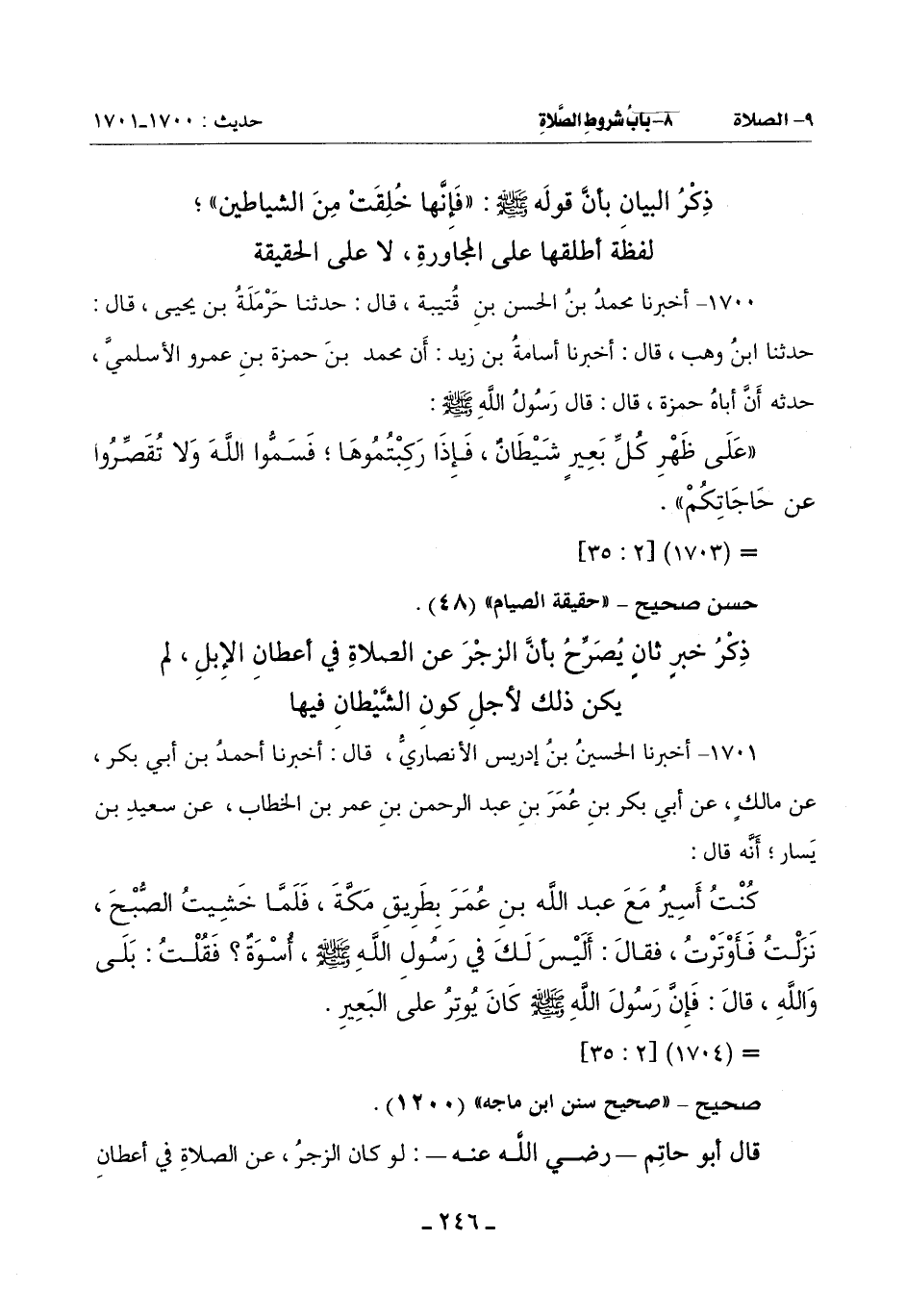 قَالَ أَبُو حَاتِمٍ رَضِيَ اللَّهُ عَنْهُ: لَوْ كَانَ الزَّجْرُ عَنِ الصَّلَاةِ فِي أَعْطَانِ -[247]- الْإِبِلِ لِأَجَلِ أَنَّهَا خُلِقَتْ مِنَ الشَّيَاطِينِ لَمْ يُصَلِّ صَلَّى اللَّهُ عَلَيْهِ وَسَلَّمَ عَلَى الْبَعِيرِ إِذْ مُحَالٌ أَنْ لَا تَجُوزَ الصَّلَاةُ فِي الْمَوَاضِعِ الَّتِي قَدْ يَكُونُ فِيهَا الشَّيْطَانُ ثُمَّ تَجُوزُ الصَّلَاةُ عَلَى الشَّيْطَانِ نَفْسِهِ بَلْ مَعْنَى قَوْلِهِ صَلَّى اللَّهُ عَلَيْهِ وَسَلَّمَ: (إِنَّهَا خُلِقَتْ مِنَ الشَّيَاطِينِ) أَرَادَ بِهِ أَنَّ مَعَهَا الشَّيَاطِينُ عَلَى سَبِيلِ الْمُجَاوَرَةِ وَالْقُرْبِ