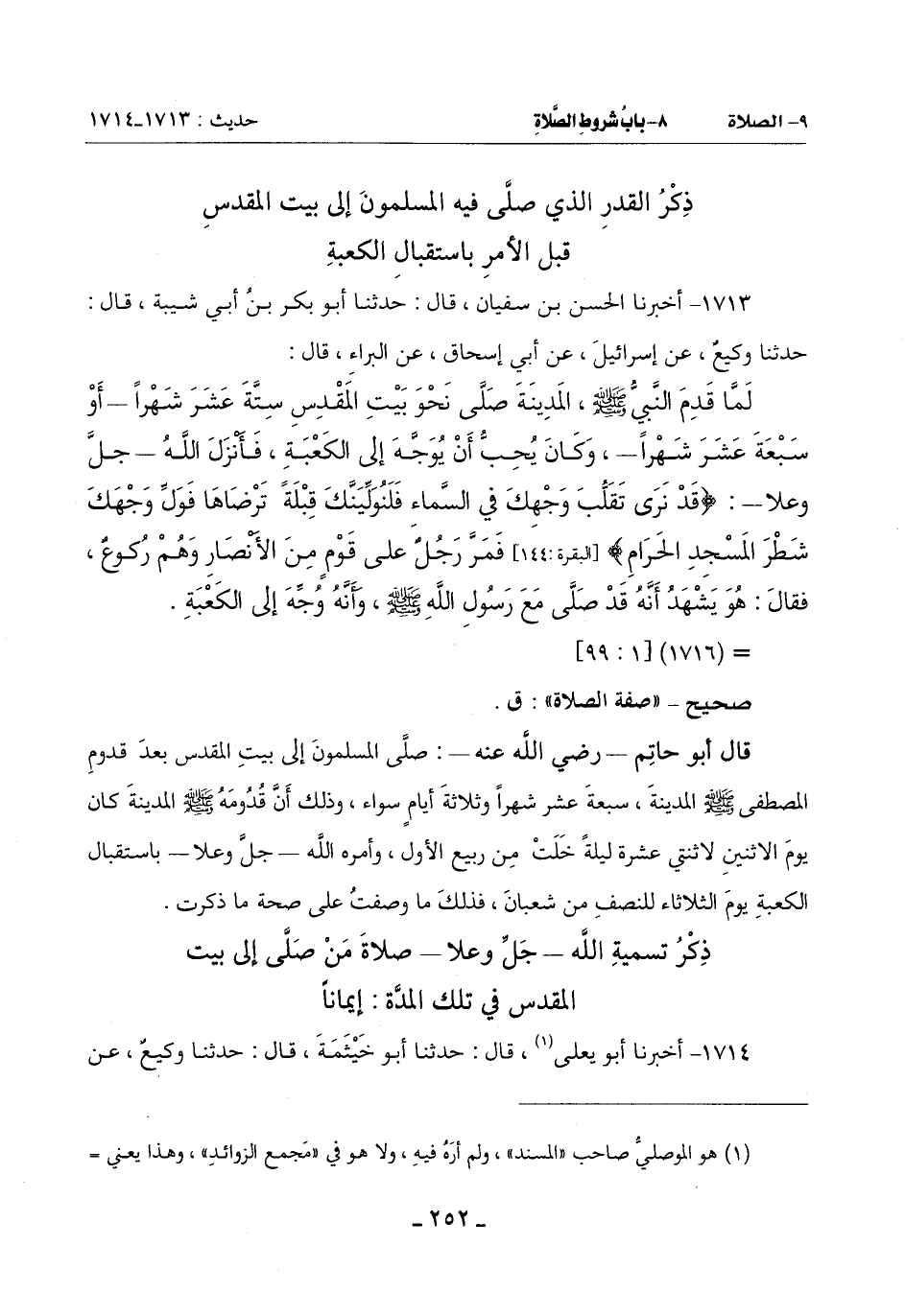 قَالَ أَبُو حَاتِمٍ رَضِيَ اللَّهُ عَنْهُ: صَلَّى الْمُسْلِمُونَ إِلَى بَيْتِ الْمَقْدِسِ بَعْدَ قَدُومِ الْمُصْطَفَى صَلَّى اللَّهُ عَلَيْهِ وَسَلَّمَ الْمَدِينَةَ سبعة عشر شهراً وثلاثة أيام سوداء وَذَلِكَ أَنَّ قُدُومَهُ صَلَّى اللَّهُ عَلَيْهِ وَسَلَّمَ الْمَدِينَةَ كَانَ يَوْمَ الِاثْنَيْنِ لِاثْنَتَيْ عَشْرَةَ لَيْلَةً خَلَتْ مِنْ رَبِيعٍ الْأَوَّلِ وَأَمَرَهُ اللَّهُ جَلَّ وَعَلَا بِاسْتِقْبَالِ الْكَعْبَةِ يَوْمَ الثُّلَاثَاءِ لِلْنِصْفِ مِنْ شَعْبَانَ فَذَلِكَ مَا وَصَفْتُ عَلَى صِحَّةِ مَا ذكرت