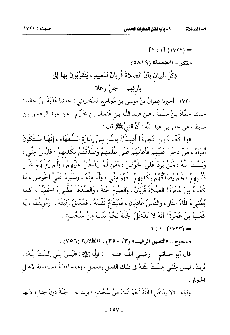 (يَا كَعْبُ بْنَ عُجْرَةَ أُعِيذُكَ بِاللَّهِ مِنْ إِمَارَةِ السُّفَهَاءِ إِنَّهَا سَتَكُونُ أُمَرَاءُ مَنْ دَخَلَ عَلَيْهِمْ فَأَعَانَهُمْ عَلَى ظُلْمِهِمْ وَصَدَّقَهُمْ بِكَذِبِهِمْ فَلَيْسَ مِنِّي وَلَسْتُ مِنْهُ وَلَنْ يَرِدَ عَلَيَّ الْحَوْضَ وَمَنْ لَمْ يَدْخُلْ عَلَيْهِمْ وَلَمْ يُعِنْهُمْ عَلَى ظُلْمِهِمْ وَلَمْ يُصَدِّقْهُمْ بِكَذِبِهِمْ فَهُوَ مِنِّي وَأَنَا مِنْهُ وَسَيَرِدُ عَلَيَّ الْحَوْضَ يَا كَعْبُ بْنَ عُجْرَةَ الصَّلَاةُ قُرْبَانٌ وَالصَّوْمُ جُنَّةٌ وَالصَّدَقَةُ تُطْفِئُ الْخَطِيَّةَ كَمَا يُطْفِئُ الْمَاءُ النَّارَ وَالنَّاسُ غَادِيَانِ فَمُبْتَاعٌ نَفْسَهُ فَمُعْتِقٌ رَقَبَتَهُ وَمُوبِقُهَا يَا كَعْبُ بْنَ عُجْرَةَ إِنَّهُ لَا يَدْخُلُ الْجَنَّةَ لَحْمٌ نَبَتَ مِنْ سُحْتٍ)