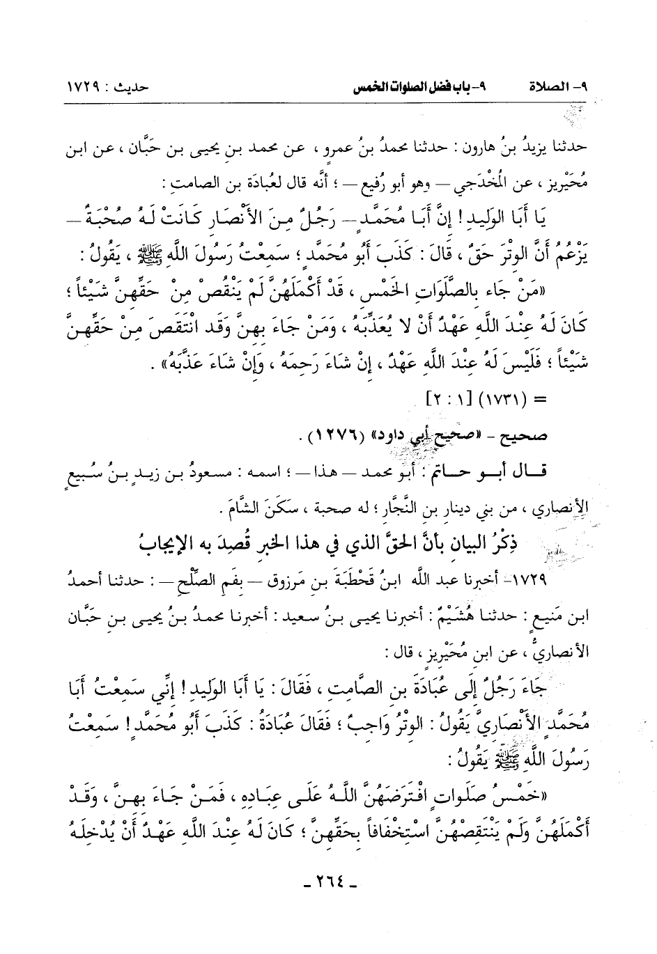 جَاءَ رَجُلٌ إِلَى عُبَادَةَ بْنِ الصَّامِتِ فَقَالَ: يَا أَبَا الْوَلِيدِ إِنِّي سَمِعْتُ أَبَا مُحَمَّدٍ الْأَنْصَارِيَّ يَقُولُ: الْوِتْرُ وَاجِبٌ فَقَالَ عُبَادَةُ: كَذَبَ أَبُو مُحَمَّدٍ سَمِعْتُ رَسُولَ اللَّهِ صَلَّى اللَّهُ عَلَيْهِ وَسَلَّمَ يَقُولُ: