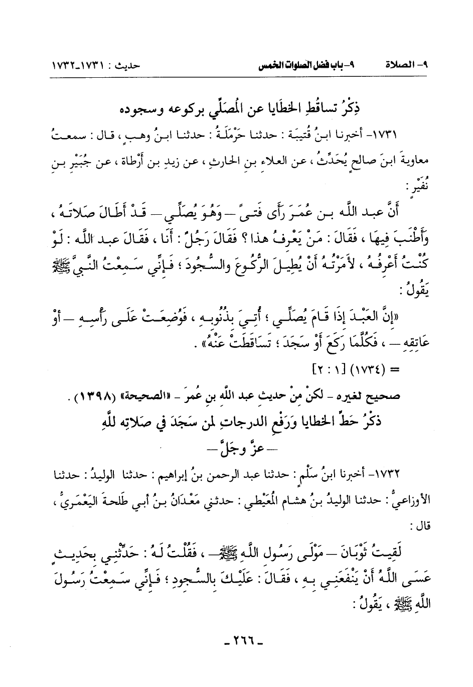 لَقِيتُ ثَوْبَانَ مَوْلَى رَسُولِ اللَّهِ صَلَّى اللَّهُ عَلَيْهِ وَسَلَّمَ فَقُلْتُ لَهُ: حَدِّثْنِي بِحَدِيثٍ عَسَى اللَّهُ أَنْ يَنْفَعَنِي بِهِ فَقَالَ: عَلَيْكَ بِالسُّجُودِ فَإِنِّي سَمِعْتُ رَسُولَ اللَّهِ صَلَّى اللَّهُ عَلَيْهِ وسلم يقول: -[267]-