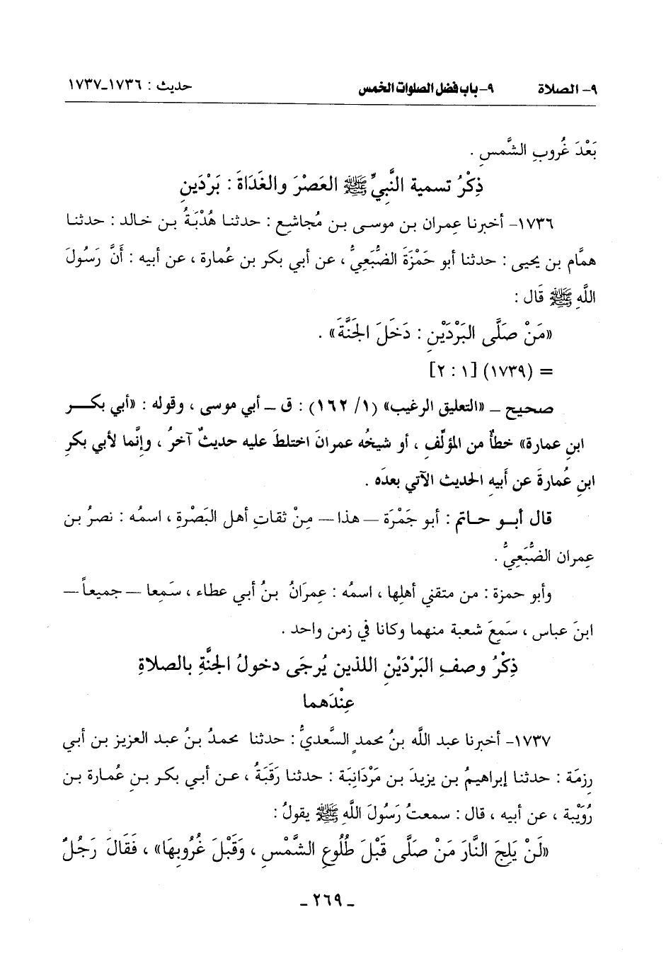 ذِكْرُ وَصْفِ الْبَرْدَيْنِ اللَّذَيْنِ يُرْجَى دُخُولُ الْجَنَّةِ بالصلاة عندهما