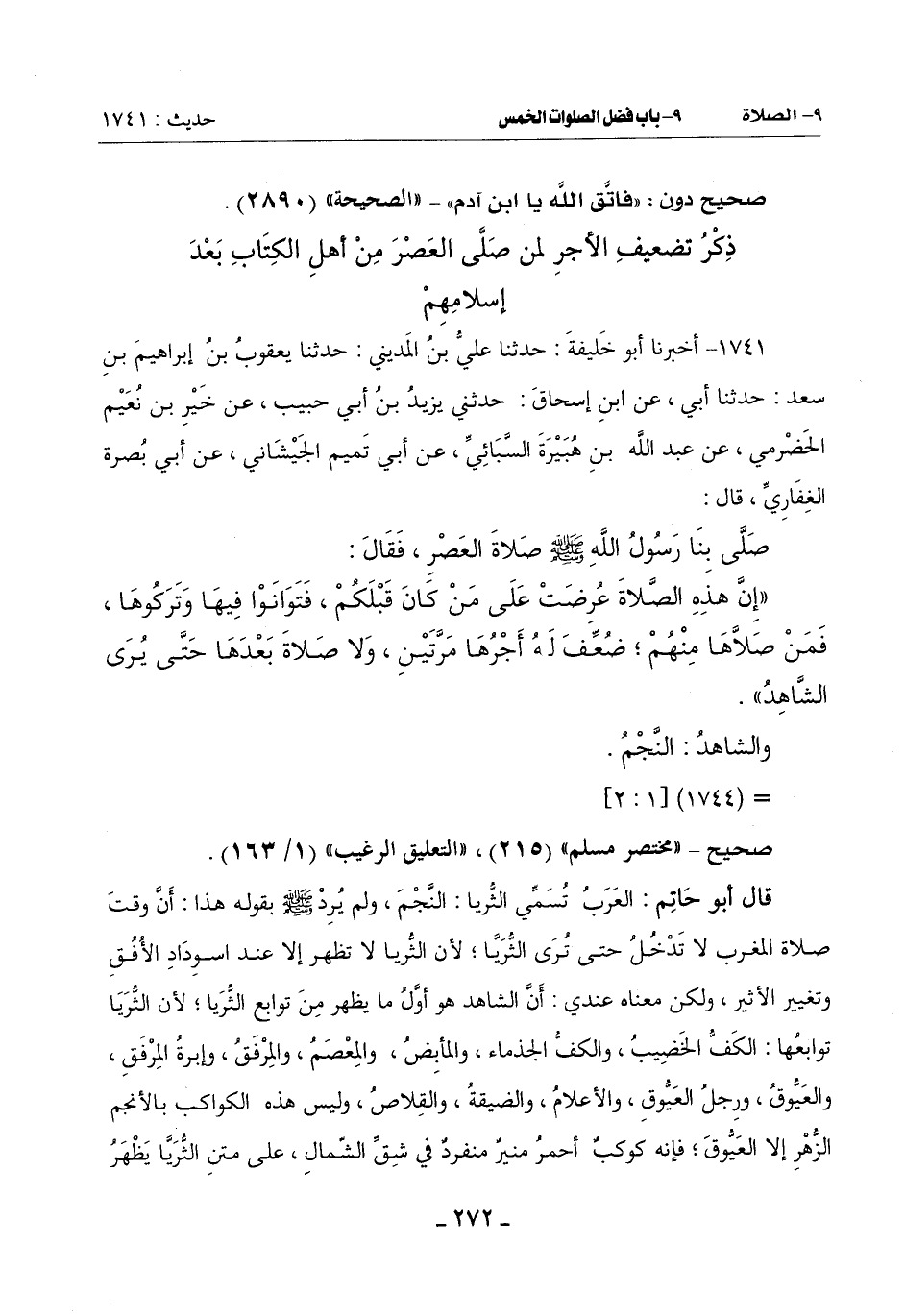 قَالَ أَبُو حَاتِمٍ: الْعَرَبُ تُسَمِّي الثُّرَيَّا: النَّجْمَ وَلَمْ يُرد صَلَّى اللَّهُ عَلَيْهِ وَسَلَّمَ بِقَوْلِهِ هَذَا أَنَّ وَقْتَ صَلَاةِ الْمَغْرِبِ لَا تَدْخُلُ حَتَّى تُرى الثُّرَيَّا لِأَنَّ الثُّرَيَّا لَا تَظْهَرُ إِلَّا عِنْدَ اسْوِدَادِ الْأُفُقِ وَتَغْيِيرِ الْأَثِيرِ وَلَكِنْ مَعْنَاهُ عِنْدِي: أَنَّ الشَّاهِدَ هُوَ أَوَّلُ مَا يَظْهَرُ مِنْ تَوَابِعِ الثُّرَيَّا لِأَنَّ الثُّرَيَّا تَوَابِعُهَا الْكَفُّ الْخَضِيبُ وَالْكَفُّ الْجَذْمَاءُ وَالْمَأْبِضُ وَالْمِعْصَمُ وَالْمِرْفَقُ وَإِبْرَةُ الْمِرْفَقِ وَالْعَيُّوقُ ورِجلُ الْعَيُّوقِ وَالْأَعْلَامُ وَالضَّيِّقَةُ وَالْقِلَاصُ وَلَيْسَ هَذِهِ الْكَوَاكِبُ بِالْأَنْجُمِ الزُّهْرِ إِلَّا الْعُيُّوقَ فَإِنَّهُ كَوْكَبٌ أَحْمَرُ مُنِيرٌ مُنْفَرِدٌ فِي شِقِّ الشِّمَالِ عَلَى مَتْنِ الثُّرَيَّا يَظْهَرُ -[273]- عِنْدَ غَيْبُوبَةِ الشَّمْسِ فَإِذَا كَانَ الْإِنْسَانُ فِي بَصَرِهِ أَدْنَى حِدَّةٍ وَغَابَتِ الشَّمْسُ يَرَى الْعَيُّوقَ وَهُوَ الشَّاهِدُ الَّذِي تَحِلُّ صَلَاةُ الْمَغْرِبِ عِنْدَ ظُهُورِهِ