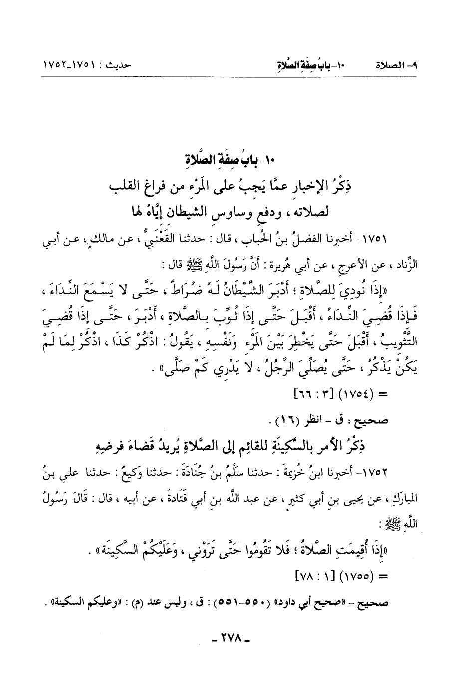 1752 - أَخْبَرَنَا ابْنُ خُزَيْمَةَ حَدَّثَنَا سَلْمُ بْنُ جُنَادَةَ حَدَّثَنَا وَكِيعٌ حَدَّثَنَا عَلِيُّ بْنُ الْمُبَارَكِ عَنْ يَحْيَى بْنِ أَبِي كَثِيرٍ عَنْ عَبْدِ اللَّهِ بْنِ أَبِي قَتَادَةَ عَنْ أَبِيهِ قَالَ: قَالَ رَسُولُ اللَّهِ صَلَّى اللَّهُ عَلَيْهِ وَسَلَّمَ: