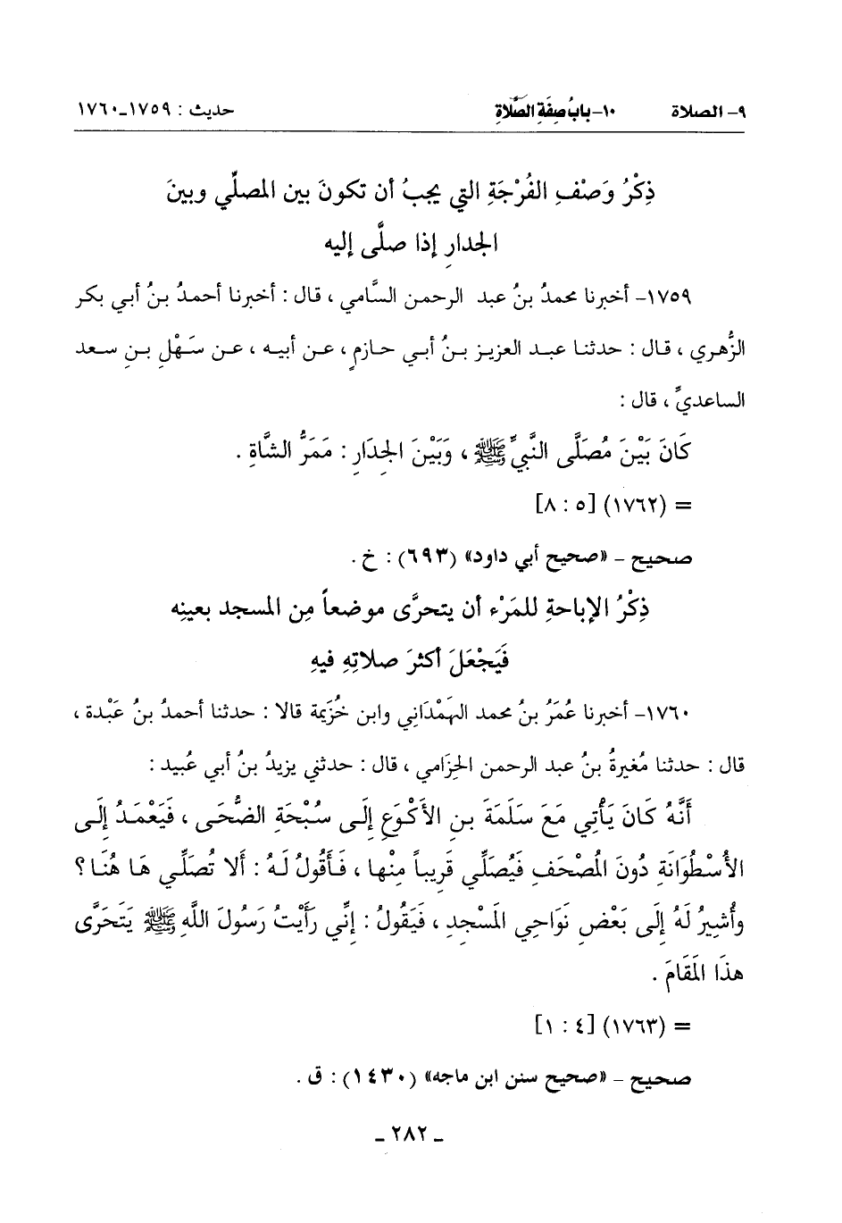 (كَانَ بَيْنَ مُصَلَّى النَّبِيِّ صَلَّى اللَّهُ عَلَيْهِ وَسَلَّمَ وَبَيْنَ الْجِدَارِ مَمَرُّ الشاة)