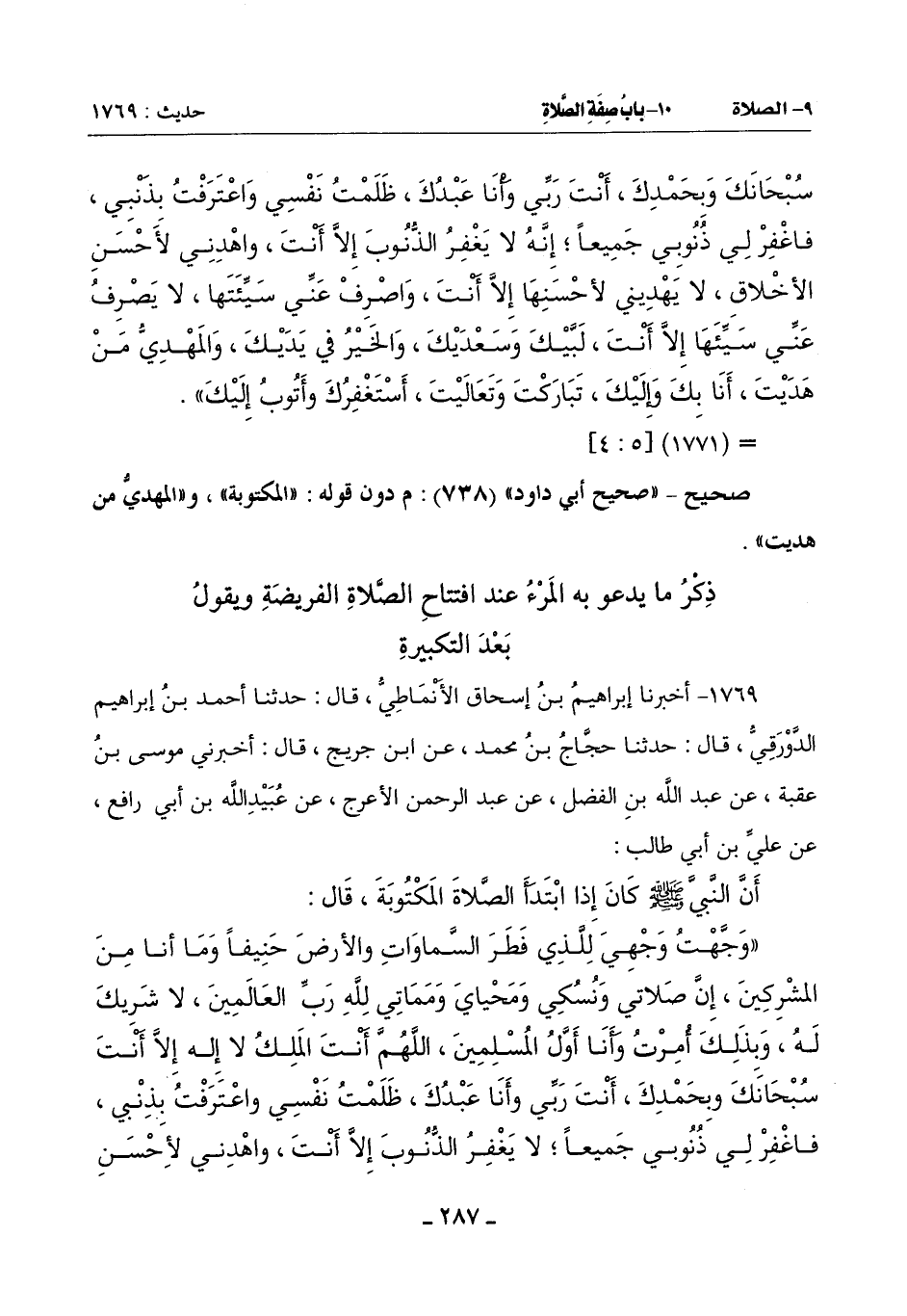 (وَجَّهْتُ وَجْهِيَ لِلَّذِي فَطَرَ السَّمَاوَاتِ وَالْأَرْضَ حَنِيفًا وَمَا أَنَا مِنَ الْمُشْرِكِينَ إِنَّ صَلَاتِي وَنُسُكِي وَمَحْيَايَ وَمَمَاتِي لِلَّهِ رَبِّ الْعَالَمِينَ لَا شَرِيكَ لَهُ وَبِذَلِكَ أُمِرْتُ وَأَنَا أَوَّلُ الْمُسْلِمِينَ اللَّهُمَّ أَنْتَ الْمَلِكُ لَا إِلَهَ إِلَّا أَنْتَ سُبْحَانَكَ وَبِحَمْدِكَ أَنْتَ رَبِّي وَأَنَا عَبْدُكَ ظَلَمْتُ نَفْسِي وَاعْتَرَفْتُ بِذَنْبِي فَاغْفِرْ لِي ذُنُوبِي جَمِيعًا لَا يَغْفِرُ الذُّنُوبَ إِلَّا أَنْتَ وَاهْدِنِي لِأَحْسَنِ -[288]- الْأَخْلَاقِ لَا يَهْدِي لِأَحْسَنِهَا إِلَّا أَنْتَ وَاصْرِفْ عَنِّي سَيِّئَهَا لَا يَصْرِفُ عَنِّي سَيِّئَهَا إِلَّا أَنْتَ لَبَّيْكَ وَسَعْدَيْكَ وَالْخَيْرُ بِيَدَيْكَ وَالْمَهْدِيُّ مَنْ هَدَيْتَ أَنَا بِكَ وَإِلَيْكَ تَبَارَكْتَ وتعاليت أستغفرك وأتوب إليك)