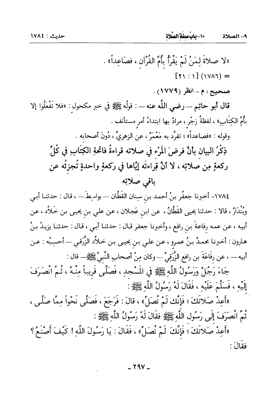 1784 - أَخْبَرَنَا جَعْفَرُ بْنُ أَحْمَدَ بْنِ سِنَانٍ الْقَطَّانُ بواسط قال: حدثنا أبي وبندار قالا: حَدَّثَنَا يَحْيَى الْقَطَّانُ عَنِ ابْنِ عَجْلَانَ عَنْ عَلِيِّ بْنِ يَحْيَى بْنِ خَلَّادٍ عَنْ أَبِيهِ عَنْ عَمِّهِ رِفَاعَةَ بْنِ رَافِعٍ وَأَخْبَرَنَا جَعْفَرٌ قَالَ: حَدَّثَنَا أَبِي قَالَ: حَدَّثَنَا يَزِيدُ بْنُ هَارُونَ: أَخْبَرَنَا مُحَمَّدُ بْنُ عَمْرٍو عَنْ عَلِيِّ بْنِ يَحْيَى بْنِ خَلَّادٍ الزُّرَقِيِّ أَحْسَبُهُ عَنْ أَبِيهِ عَنْ رِفَاعَةَ بْنِ رَافِعٍ الزُّرَقِيِّ وَكَانَ مِنْ أَصْحَابِ النَّبِيِّ صَلَّى اللَّهُ عَلَيْهِ وَسَلَّمَ قَالَ: