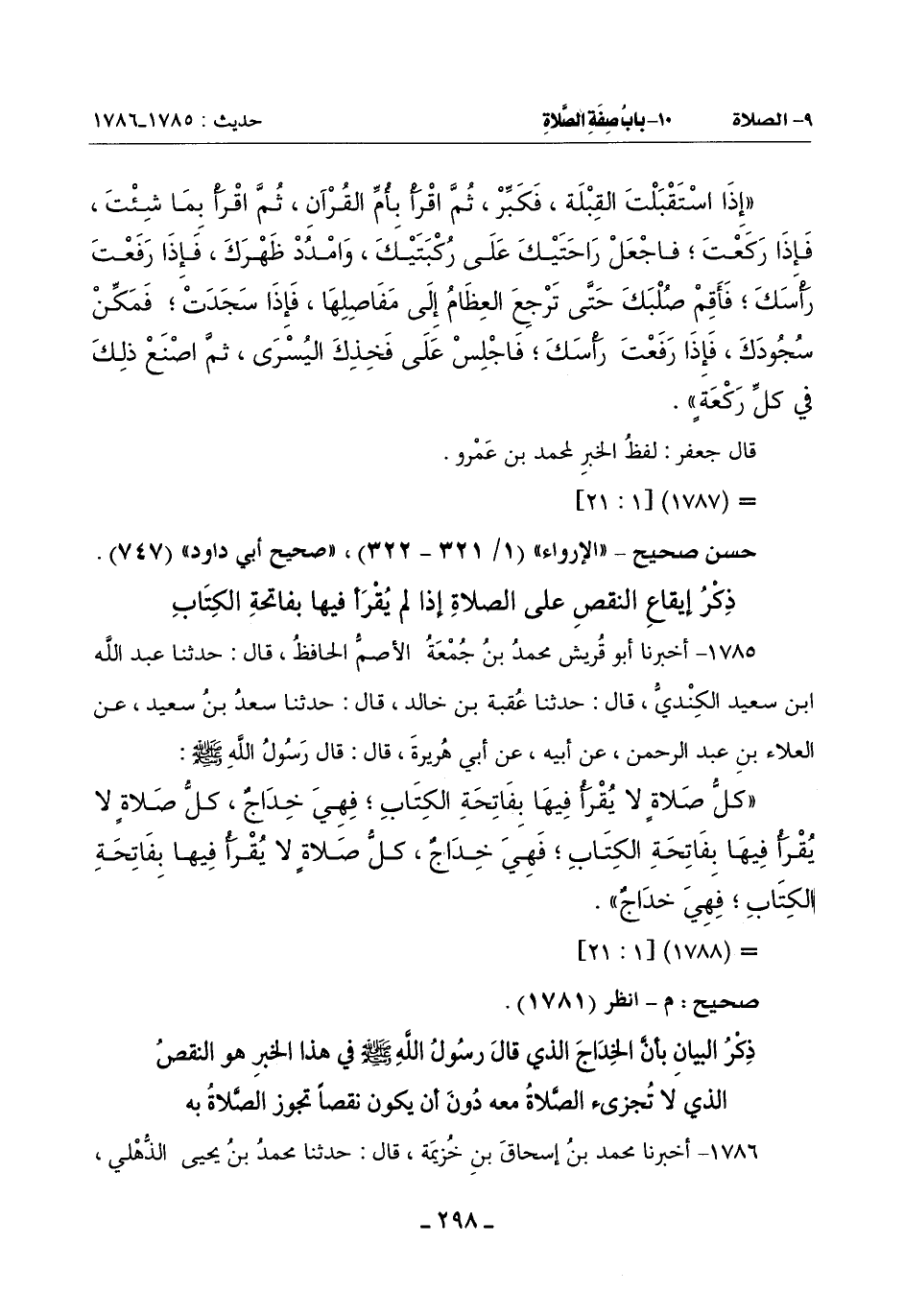 ذِكْرُ الْبَيَانِ بِأَنَّ الْخِدَاجَ الَّذِي قَالَ رَسُولُ اللَّهِ صَلَّى اللَّهُ عَلَيْهِ وَسَلَّمَ فِي هَذَا الْخَبَرِ هُوَ النَّقْصُ الَّذِي لَا تُجْزِئُ الصَّلَاةُ مَعَهُ دُونَ أَنْ يَكُونَ نَقْصًا تَجُوزُ الصَّلَاةُ به