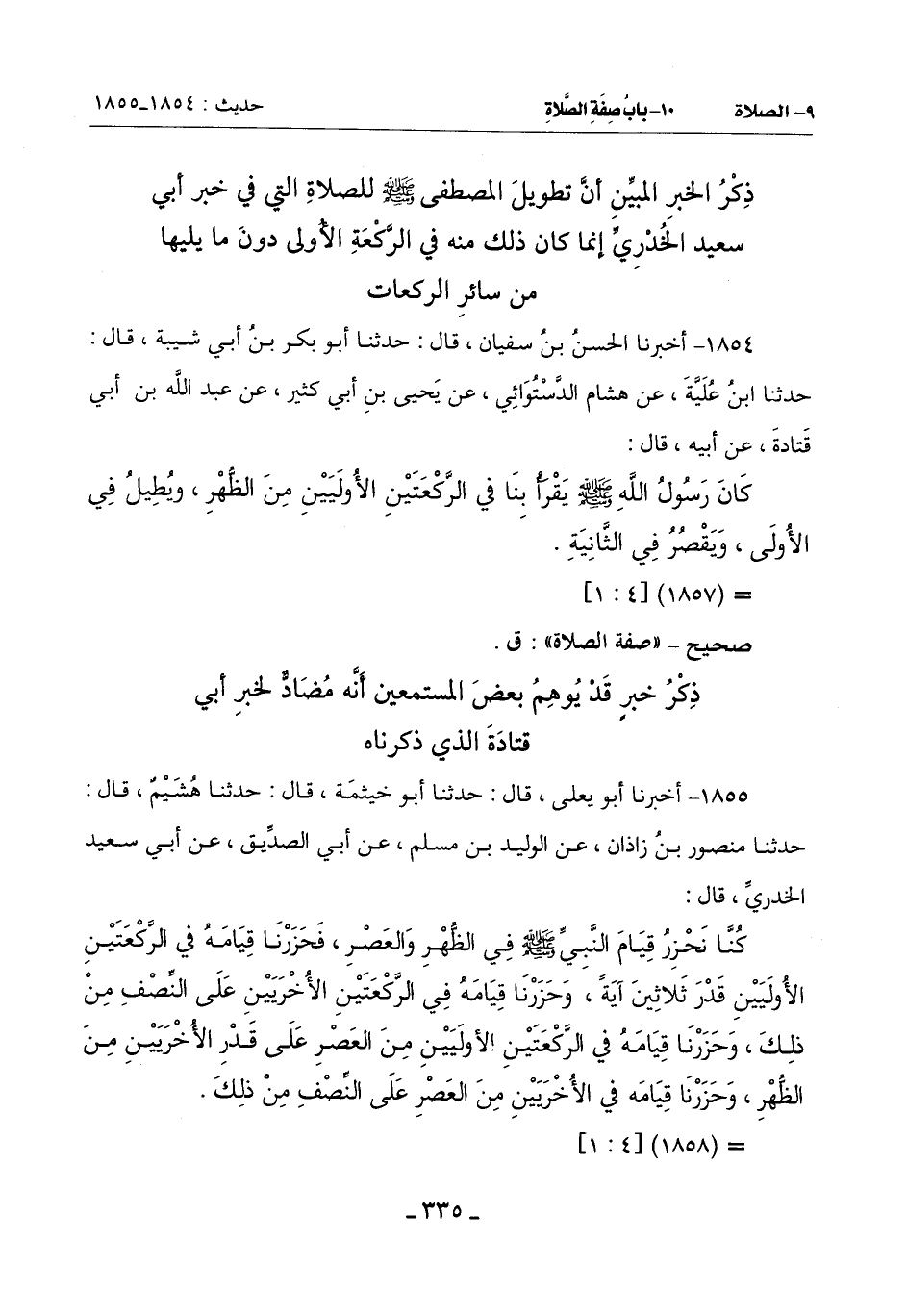 قَالَ أَبُو حَاتِمٍ رَضِيَ اللَّهُ عَنْهُ: قَوْلُ أَبِي سَعِيدٍ: (فَحَزَرْنَا قِيَامَهُ فِي الرَّكْعَتَيْنِ الْأُولَيَيْنِ قَدْرَ ثَلَاثِينَ آيَةً) يُضَادُّ فِي الظَّاهِرِ قَوْلَ أَبِي قَتَادَةَ: (وَيُطِيلُ فِي الْأُولَى وَيُقَصِّرُ فِي الثَّانِيَةِ) وَلَيْسَ ـ بِحَمْدِ اللَّهِ ومنِّه ـ كَذَلِكَ لِأَنَّ الرَّكْعَةَ الْأُولَى كَانَ يَقْرَأُ صَلَّى اللَّهُ عَلَيْهِ وَسَلَّمَ فِيهَا ثَلَاثِينَ آيَةً بِالتَّرْسِيلِ وَالتَّرْتِيلِ وَالتَّرْجِيعِ وَالرَّكْعَةَ الثَّانِيَةَ كَانَ يَقْرَأُ فِيهَا مِثْلَ قِرَاءَتِهِ فِي الْأُولَى بِلَا تَرْسِيلٍ وَلَا تَرْجِيعٍ فَتَكُونُ الْقِرَاءَتَانِ وَاحِدَةٌ وَالْأُولَى أَطْوَلُ مِنَ الثَّانِيَةِ