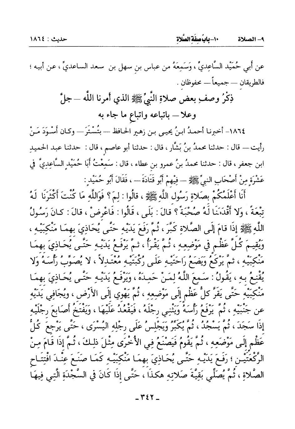 1864 - أَخْبَرَنَا أَحْمَدُ بْنُ يَحْيَى بْنِ زُهَيْرٍ الْحَافِظُ بِتُسْتَرَ - وَكَانَ أَسْوَدَ مِنْ رَأَيْتُ - قَالَ: حَدَّثَنَا مُحَمَّدُ بْنُ بَشَّارٍ قَالَ: حَدَّثَنَا أَبُو عَاصِمٍ قَالَ: حَدَّثَنَا عَبْدُ الْحَمِيدِ بْنُ جَعْفَرٍ قَالَ: حَدَّثَنَا مُحَمَّدُ بْنُ عَمْرِو بْنِ عَطَاءٍ قَالَ: سَمِعْتُ أَبَا حُمَيْدٍ السَّاعِدِيَّ: فِي عَشْرَةٍ مِنْ أَصْحَابِ النَّبِيِّ صَلَّى اللَّهُ عَلَيْهِ وَسَلَّمَ فِيهِمْ أَبُو قَتَادَةَ فَقَالَ أَبُو حُمَيْدٍ: