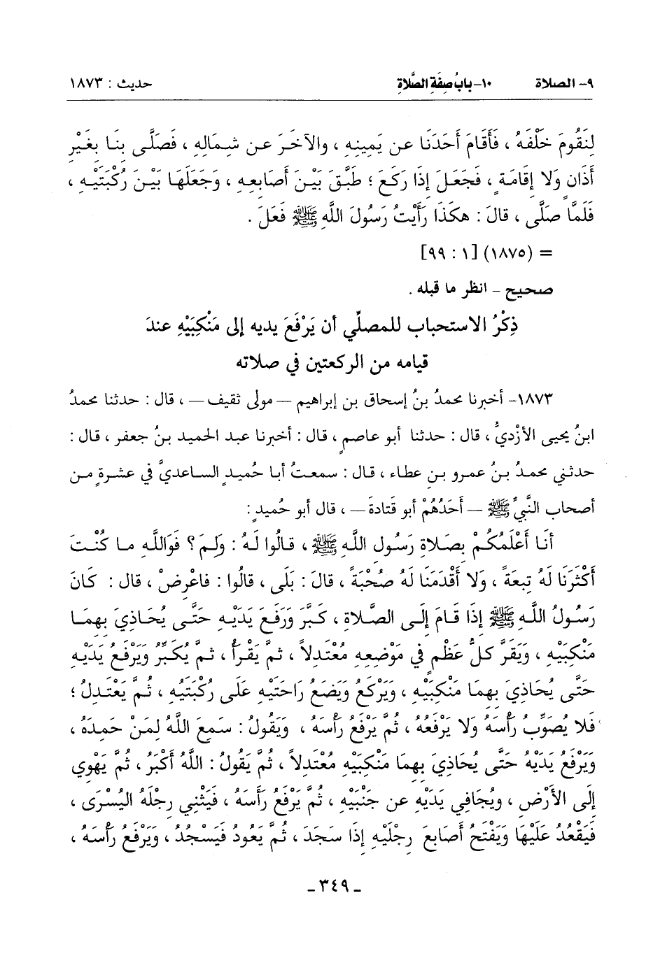1873 - أَخْبَرَنَا مُحَمَّدُ بْنُ إِسْحَاقَ بْنِ إِبْرَاهِيمَ مَوْلَى ثَقِيفٍ قَالَ: حَدَّثَنَا مُحَمَّدُ بْنُ يَحْيَى الْأَزْدِيُّ قَالَ: حَدَّثَنَا أَبُو عَاصِمٍ قَالَ: أَخْبَرَنَا عَبْدُ الحميد بن جعفر قال: حدثني محمد بن عَمْرِو بْنِ عَطَاءٍ قَالَ: سَمِعْتُ أَبَا حُمَيْدٍ السَّاعِدِيَّ فِي عَشْرَةٍ مِنْ أَصْحَابِ النَّبِيِّ صَلَّى اللَّهُ عَلَيْهِ وَسَلَّمَ أَحَدُهُمْ أَبُو قَتَادَةَ قَالَ أَبُو حُمَيْدٍ: