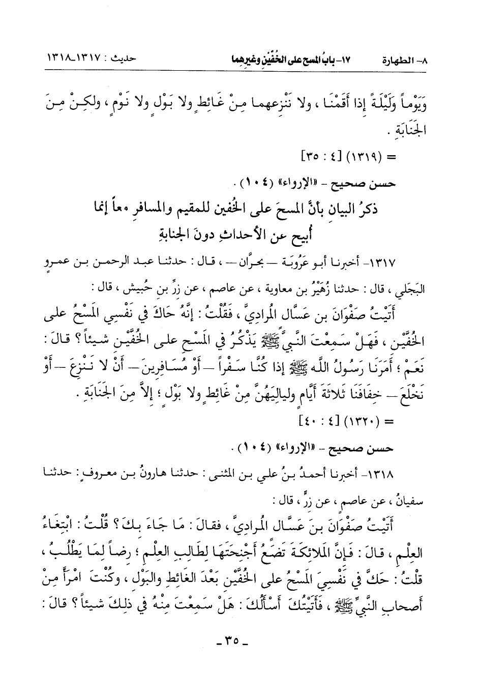 أَتَيْتُ صَفْوَانَ بْنَ عَسَّالٍ الْمُرَادِيَّ فَقَالَ: مَا جَاءَ بِكَ؟ قُلْتُ: ابْتِغَاءَ الْعِلْمِ قَالَ: فَإِنَّ الْمَلَائِكَةَ تَضَعُ أَجْنِحَتَهَا لِطَالِبِ الْعِلْمِ رِضًا لِمَا يَطْلُبُ قُلْتُ: حَكَّ فِي نَفْسِي الْمَسْحُ عَلَى الْخُفَّيْنِ بَعْدَ الْغَائِطِ وَالْبَوْلِ وكنت امْرَأً مِنْ أَصْحَابِ النَّبِيِّ صَلَّى اللَّهُ عَلَيْهِ وَسَلَّمَ فَأَتَيْتُكَ أَسْأَلُكَ: هَلْ سَمِعْتَ مِنْهُ فِي ذَلِكَ شَيْئًا؟ قَالَ: -[36]- نَعَمْ كَانَ يَأْمُرُنَا إذا كنا سفراً أو مسافرين أن لاننزع خفافنا ثلاثة أيام ولياليهن إلا من جنابة لَكِنْ مِنْ غَائِطٍ وَبَوْلٍ وَنَوْمٍ قُلْتُ لَهُ: سَمِعْتَهُ يَذْكُرُ الْهَوَى؟ قَالَ نَعَمْ بَيْنَا نَحْنُ مَعَهُ فِي مَسِيرٍ فَنَادَاهُ أَعْرَابِيٌّ بِصَوْتٍ جَهْوَرِيٍّ: يَا مُحَمَّدُ فَأَجَابَهُ عَلَى نَحْوٍ مِنْ كَلَامِهِ قَالَ: