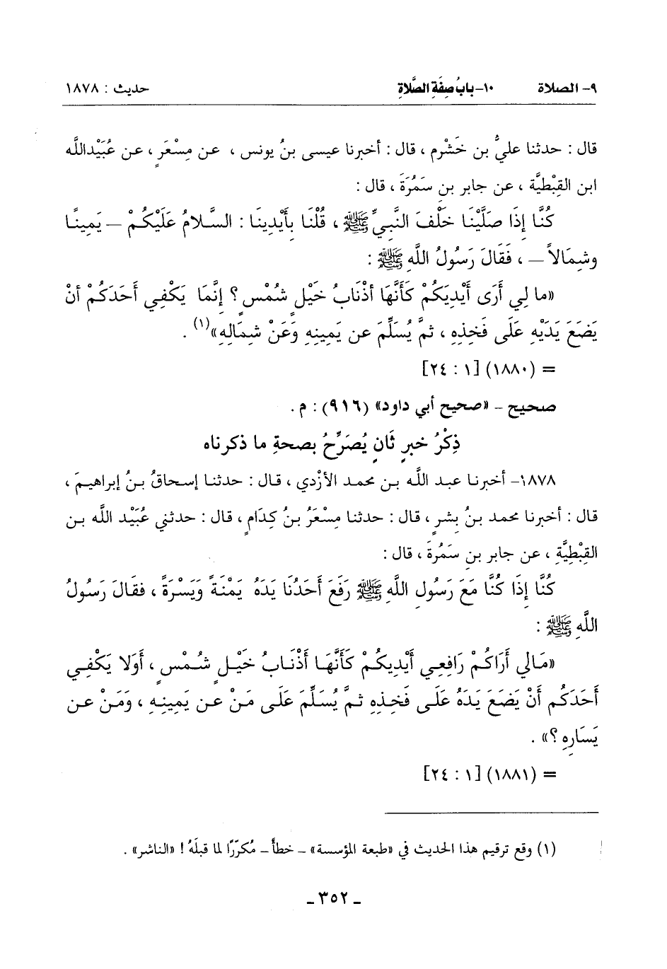(مَا لِي أَرَاكُمْ رَافِعِي أَيْدِيكُمْ كَأَنَّهَا أَذْنَابُ خَيْلٍ شُمْسٍ أو لا يَكْفِي أَحَدَكُمْ أَنْ يَضَعَ يَدَهُ عَلَى فَخِذِهِ ثُمَّ يُسَلِّمُ عَلَى مَنْ عَنْ يَمِينِهِ وَمَنْ عن يساره)