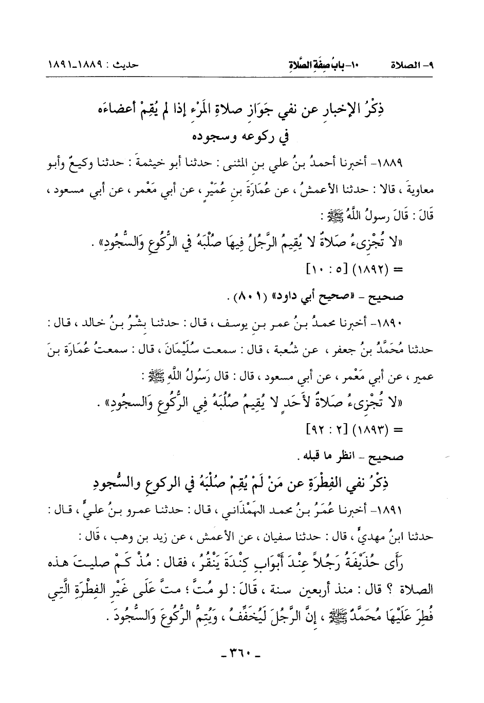 (لَا تُجْزِئُ صَلَاةٌ لَا يُقِيمُ الرَّجُلُ فِيهَا صُلْبَهُ في الركوع والسجود)