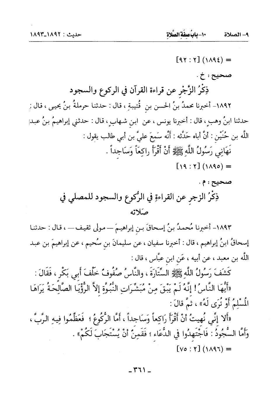 (أَلَا إِنِّي نُهِيتُ أَنْ أَقْرَأَ رَاكِعًا وَسَاجِدًا أَمَّا الرُّكُوعُ فعظِّموا فِيهِ الرَّبَّ وَأَمَّا السُّجُودُ فَاجْتَهِدُوا فِي الدُّعَاءِ فَقَمِنٌ أَنْ يُستجاب لَكُمْ)