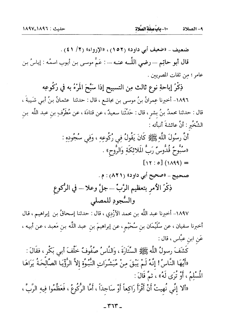 1896 - أَخْبَرَنَا عِمْرَانُ بْنُ مُوسَى بْنِ مُجَاشِعٍ قَالَ: حَدَّثَنَا عُثْمَانُ بْنُ أَبِي شَيْبَةَ قَالَ: حَدَّثَنَا مُحَمَّدُ بْنُ بِشْرٍ قَالَ: حَدَّثَنَا سَعِيدٌ عَنْ قَتَادَةَ عَنْ مُطَرِّفِ بْنِ عَبْدِ اللَّهِ بْنِ الشِّخِّيرِ أَنَّ عَائِشَةَ أَنْبَأَتْهُ