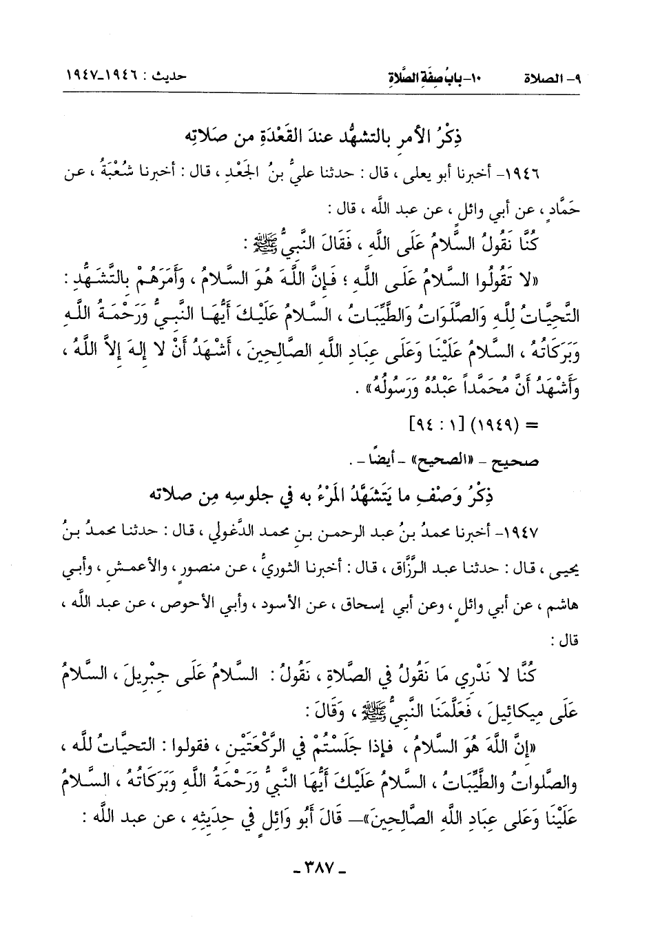 (إِنَّ اللَّهَ هُوَ السَّلَامُ فَإِذَا جَلَسْتُمْ فِي الرَّكْعَتَيْنِ فَقُولُوا: التَّحِيَّاتُ لِلَّهِ وَالصَّلَوَاتُ وَالطَّيِّبَاتُ السَّلَامُ عَلَيْكَ أَيُّهَا النَّبِيُّ وَرَحْمَةُ اللَّهِ وَبَرَكَاتُهُ السَّلَامُ عَلَيْنَا وَعَلَى عِبَادِ اللَّهِ الصَّالِحِينَ) - قَالَ أَبُو وَائِلٍ فِي حَدِيثِهِ عن عبد الله: -[388]-