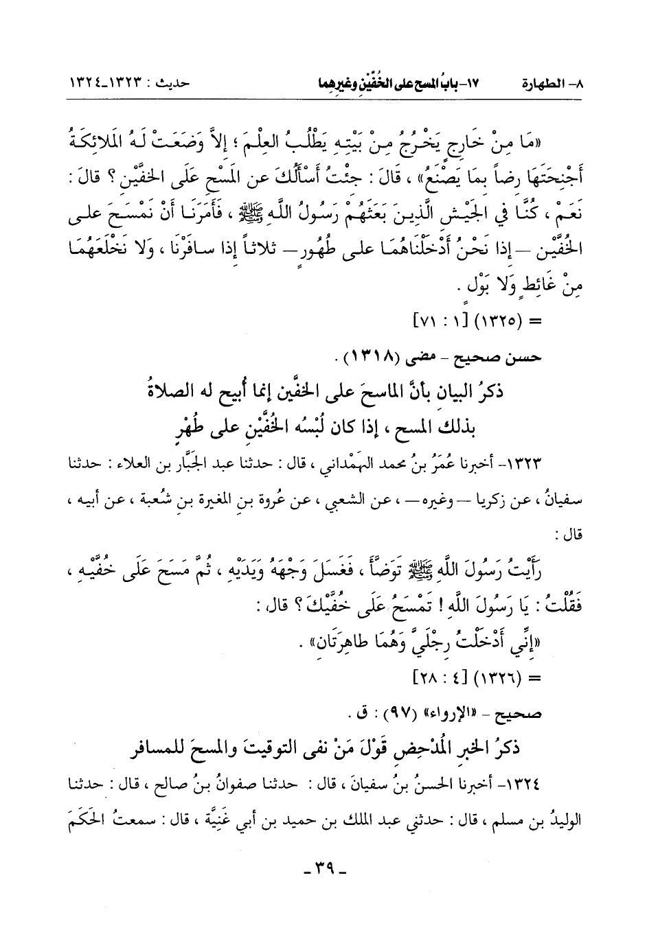 1323 - أَخْبَرَنَا عُمَرُ بْنُ مُحَمَّدٍ الْهَمْدَانِيُّ قَالَ: حَدَّثَنَا عَبْدُ الْجَبَّارِ بْنُ الْعَلَاءِ حَدَّثَنَا سُفْيَانُ عَنْ زَكَرِيَّا وَغَيْرِهِ عَنِ الشَّعْبِيِّ عَنْ عُرْوَةَ بْنِ الْمُغِيرَةِ بْنِ شُعْبَةَ عَنْ أَبِيهِ قَالَ